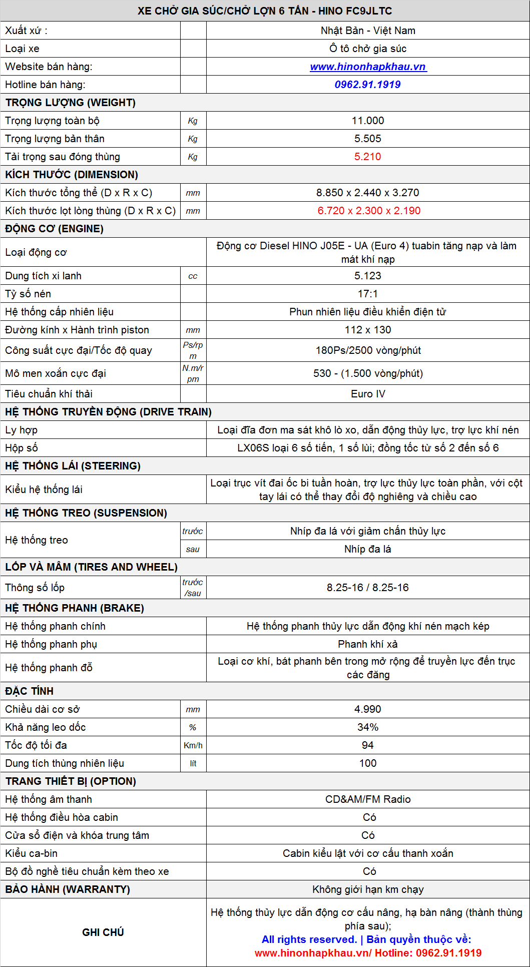 * TRANG BỊ NỘI NGOẠI THẤT XE TẢI CHỞ GIA SÚC HINO 6T MODEL FC9JLTC :