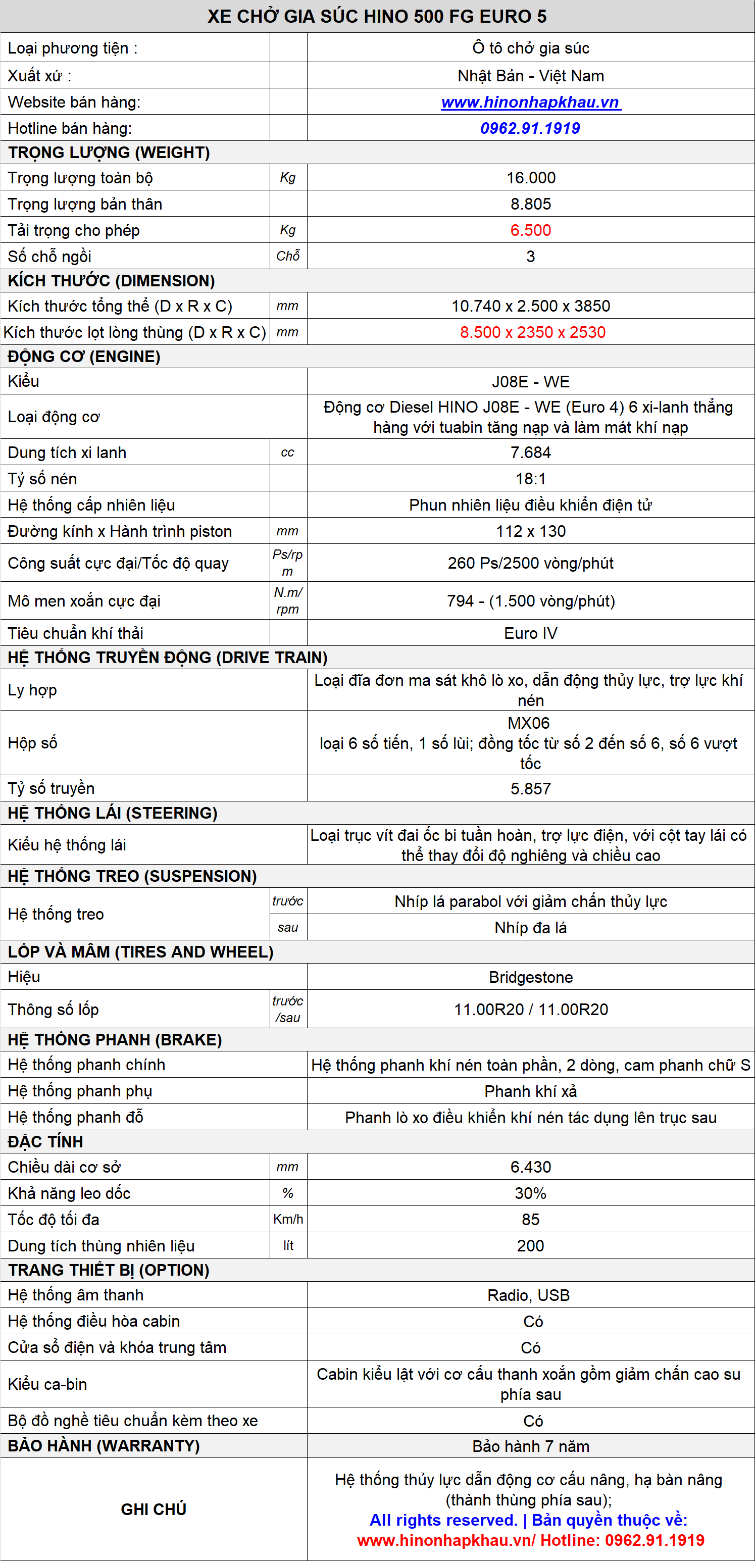 * THÔNG SỐ, ĐẶC TÍNH KỸ THUẬT XE TẢI CHỞ GIA SÚC 8 TẤN HINO 500 FG8JT8A EURO 5 MỚI:
