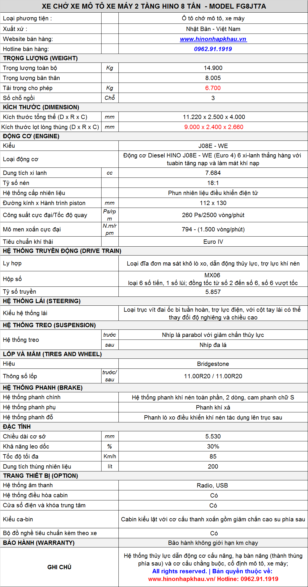 * THÔNG SỐ KỸ THUẬT CHI TIẾT XE TẢI HINO 500 CHỞ MÔ TÔ XE MÁY :