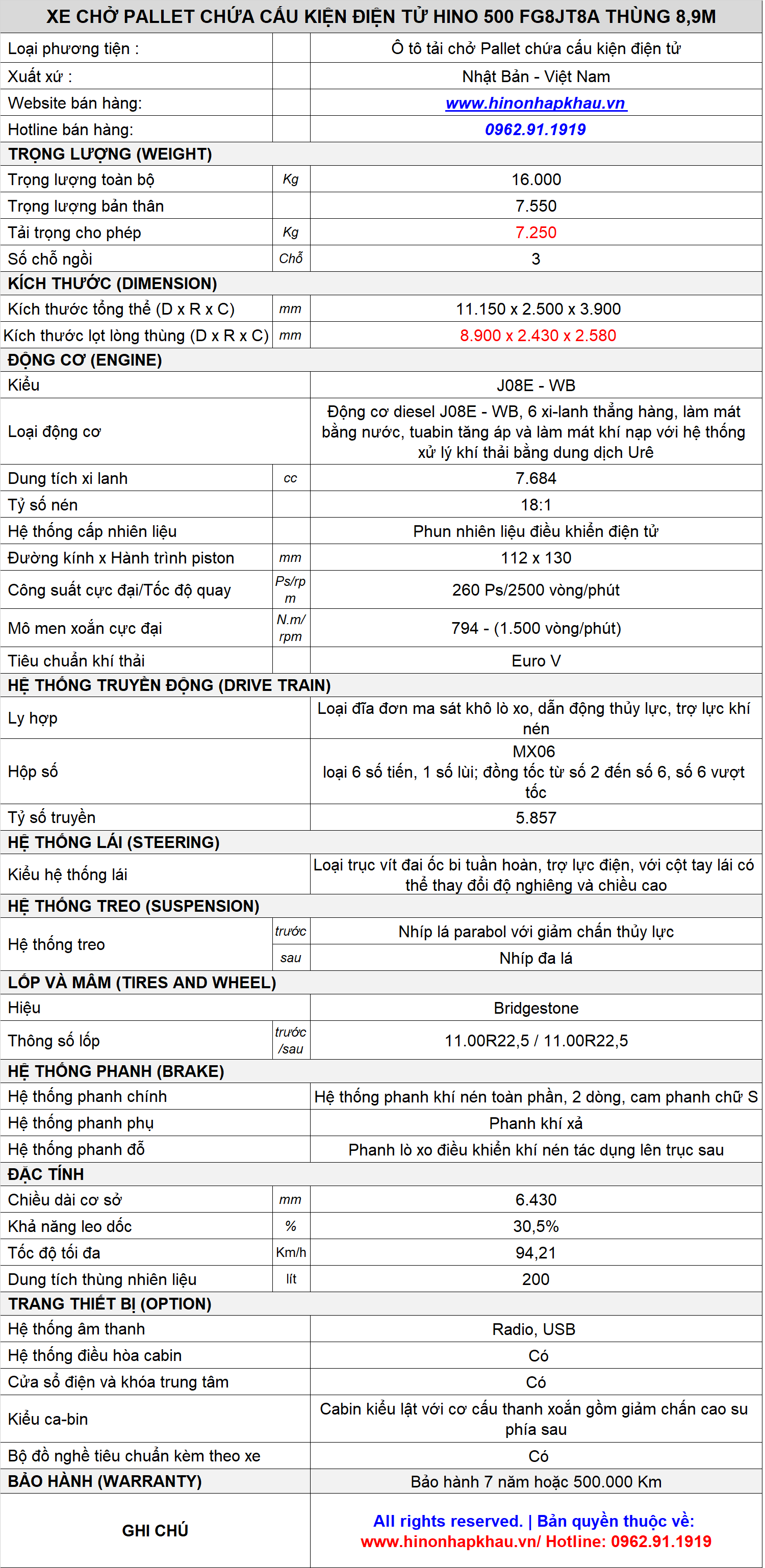 * THÔNG SỐ KỸ THUẬT XE Ô TÔ TẢI HINO CHỞ PALLET ĐIỆN TỬ - XE HINO FG8JP8A E5 THÙNG CHỞ PALLET ĐIỆN TỬ: