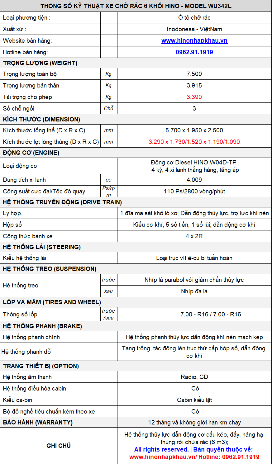 - Xe chở rác 6 khối Hino – Model WU342 là sản phẩm xe chuyên dụng hooklift chở rác sử dụng xe cơ sở là xe tải Hino Dutro nhập khẩu nguyên chiếc từ nhà máy Hino Indonesia. Hệ thống chuyên dùng được đóng mới hoàn toàn tại Việt Nam với linh kiện nhập khẩu từ các nước như Nhật, Hàn, Ý.