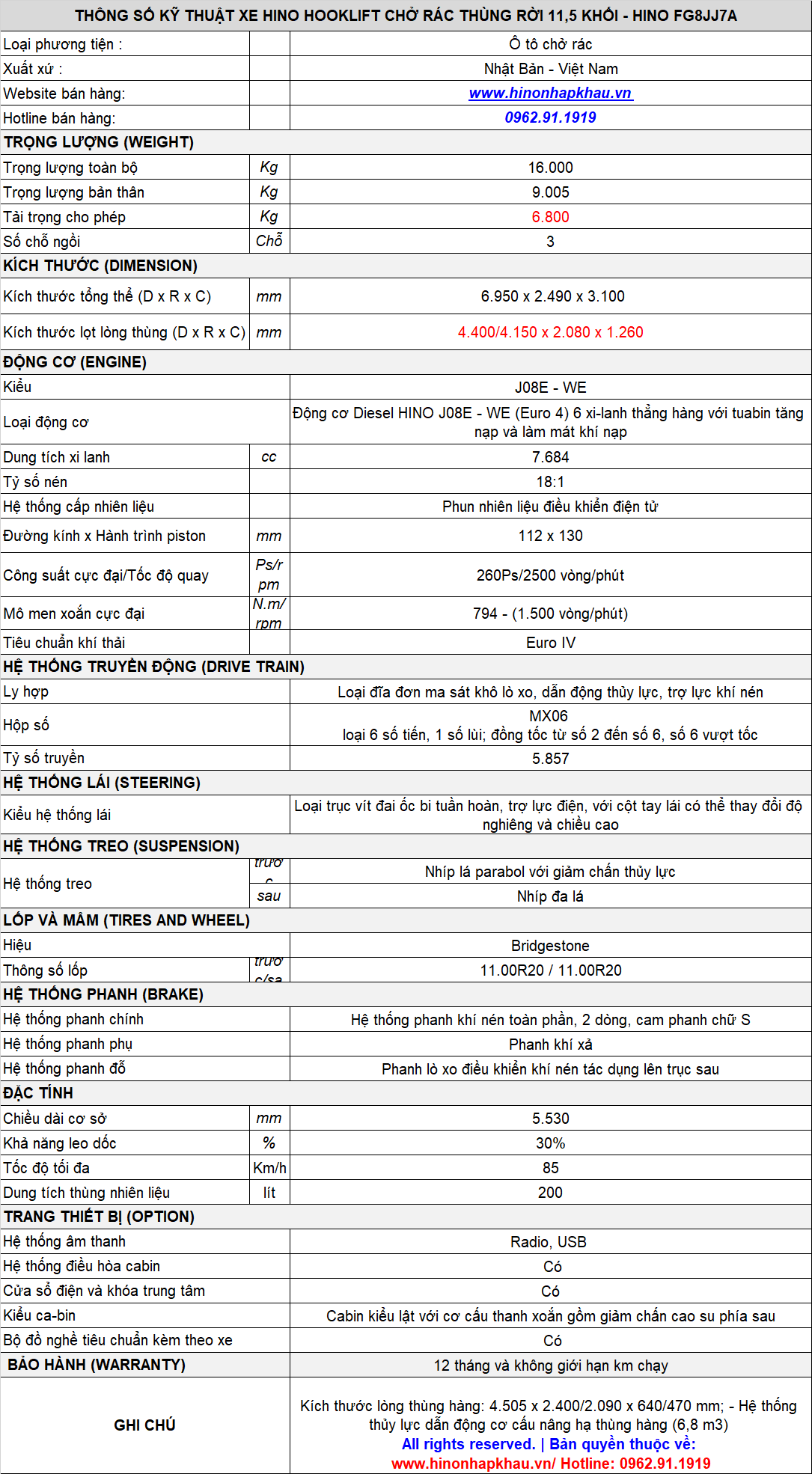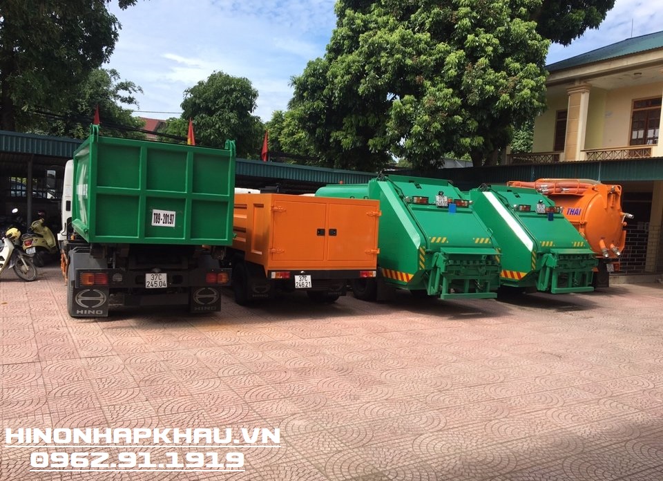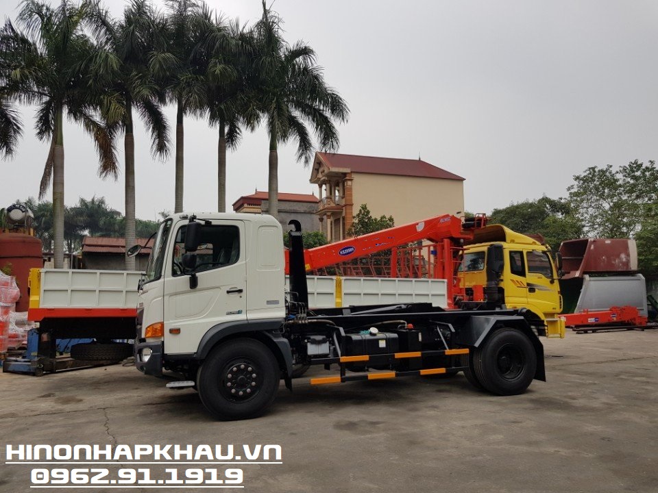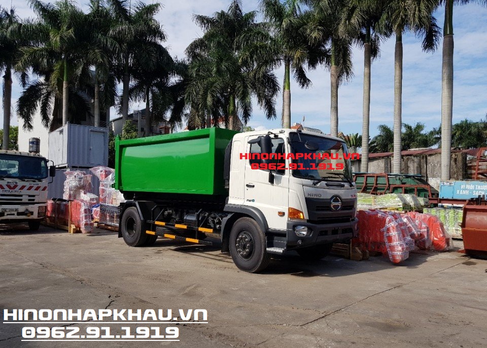 - ''Xe chở rác bùn 11m3 thùng rời Hino FG8JJ7A'' với xe cơ sở được nhập khẩu 3 cục từ nhà máy Hino Motors Nhật Bản lắp ráp tại nhà máy Hino Motors Việt Nam tiêu chuẩn khí thải Euro 4 mới nhất với thiết kế Cabin kiểu mới hoàn toàn so với phiên bản Euro 2 cũ. Xe Hooklift chở rác 11.5 khối Hino được trang bị động cơ Hino J08E - WE, 6 xylanh thẳng hàng với tua bin tăng nạp và làm mát khí nạp, dung tích xylanh 7.684 cc cho công suất 260 Ps tại 2.500 vòng/phút, đi kèm hộp số với 6 số tiến và 1 số lùi đồng tốc từ số 2 đến số 6, số 6 là số vượt tốc.