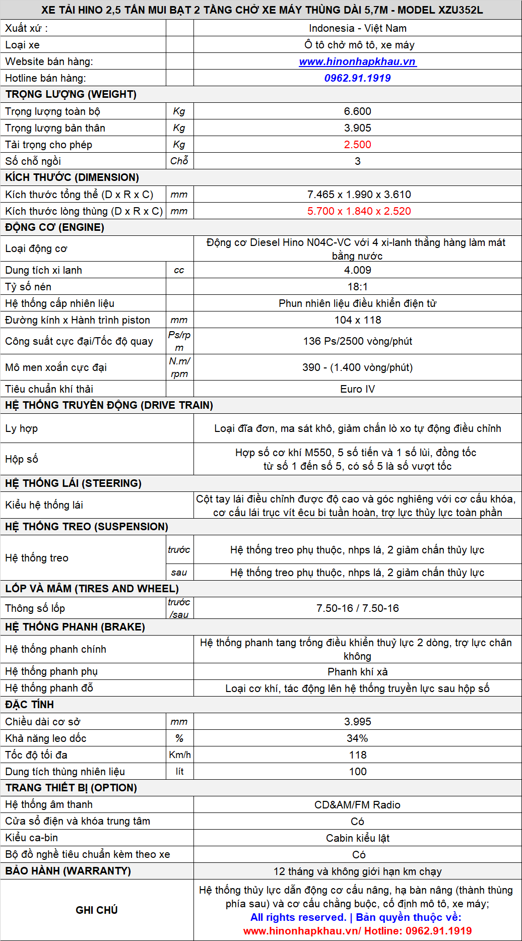 * THÔNG SỐ KỸ THUẬT XE HINO INDONESIA CHUYÊN DỤNG CHỞ XE MÔ TÔ, XE MÁY ĐIỆN, ĐẠP ĐIỆN :