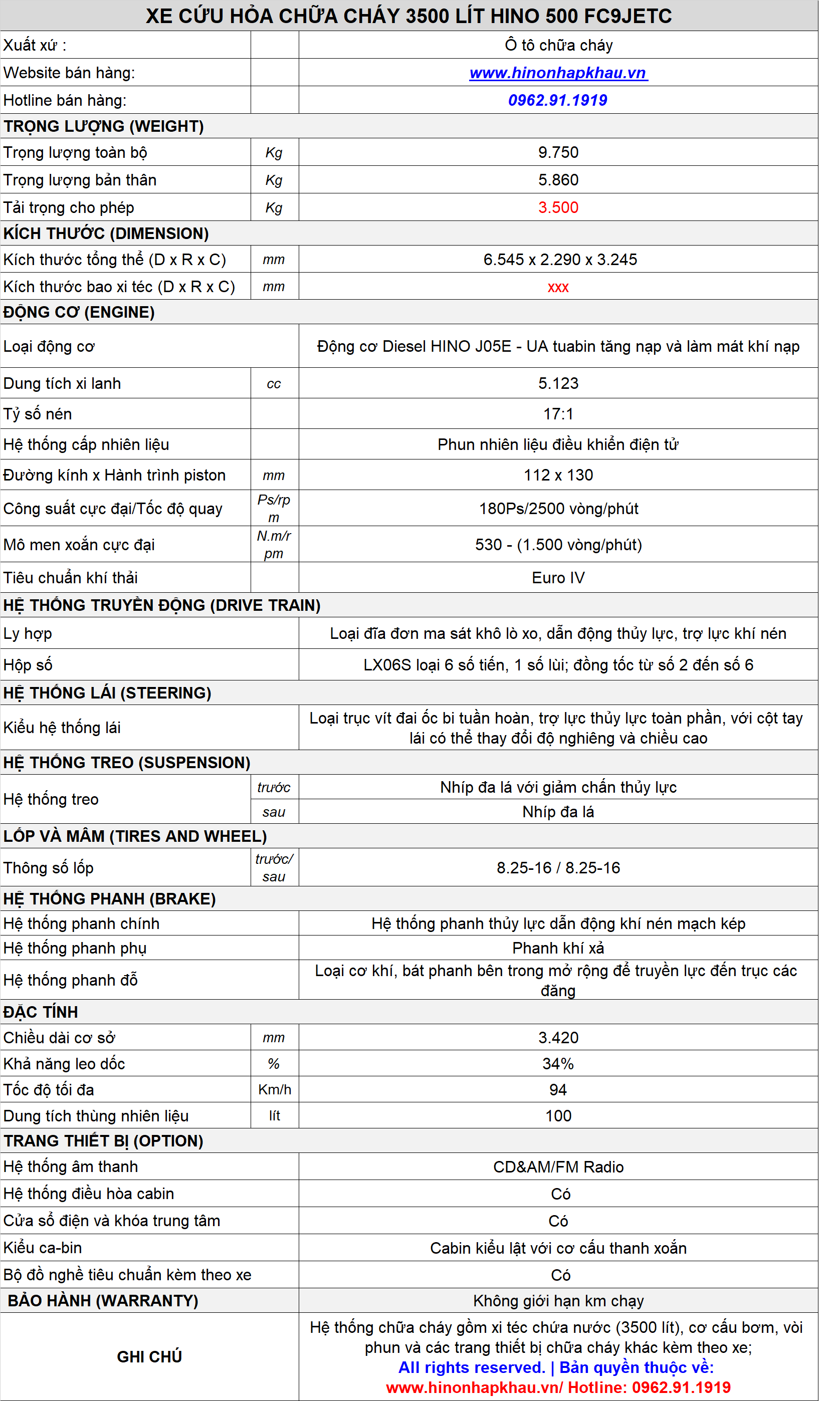 * THÔNG SỐ, ĐẶC TÍNH KỸ THUẬT XE CỨU HỎA CHỮA CHÁY 3500 LÍT HINO 500 FC9JETC: