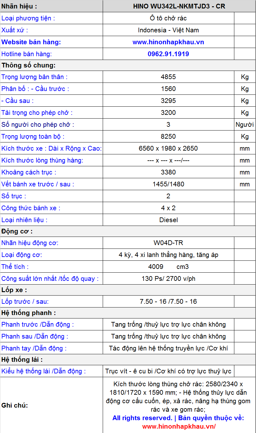 * Thông số kỹ thuật xe cuốn ép rác Hino 6m3: