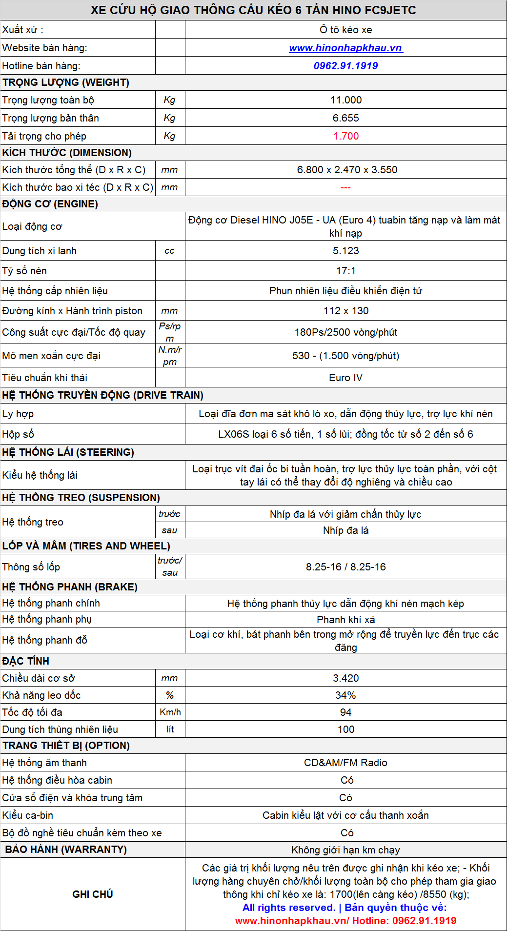 - Xuất xứ: Xe tải Hino FC9JETC cứu hộ cẩu kéo URV553 với xe cơ sở nhập khẩu 3 cục Nhật Bản lắp ráp tại Việt Nam. Cẩu UNIC 5 tấn 3 khúc Nhật Bản .