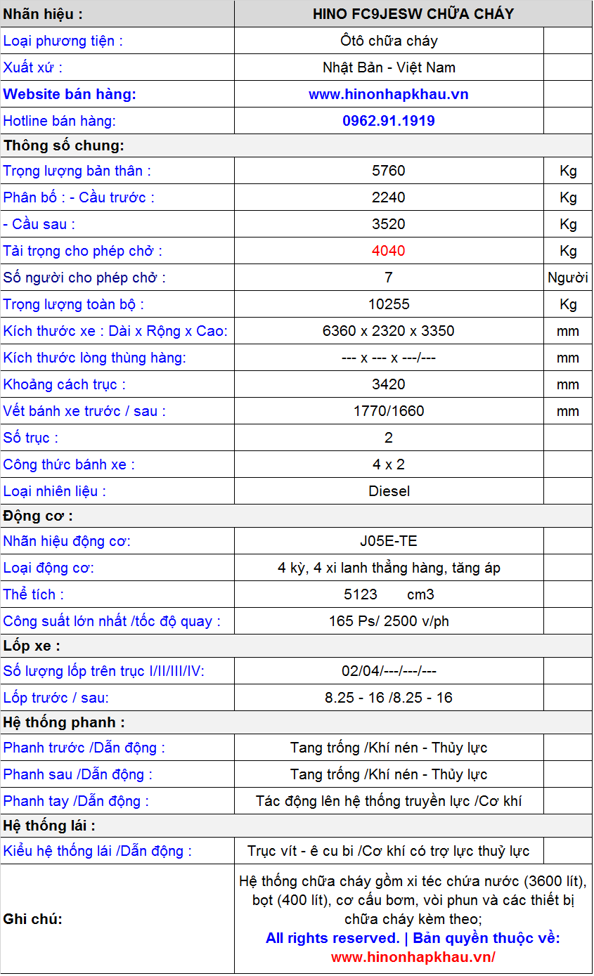 * THÔNG SỐ KỸ THUẬT XE Ô TÔ CỨU HỎA - CHỮA CHÁY HINO 4 KHỐI: