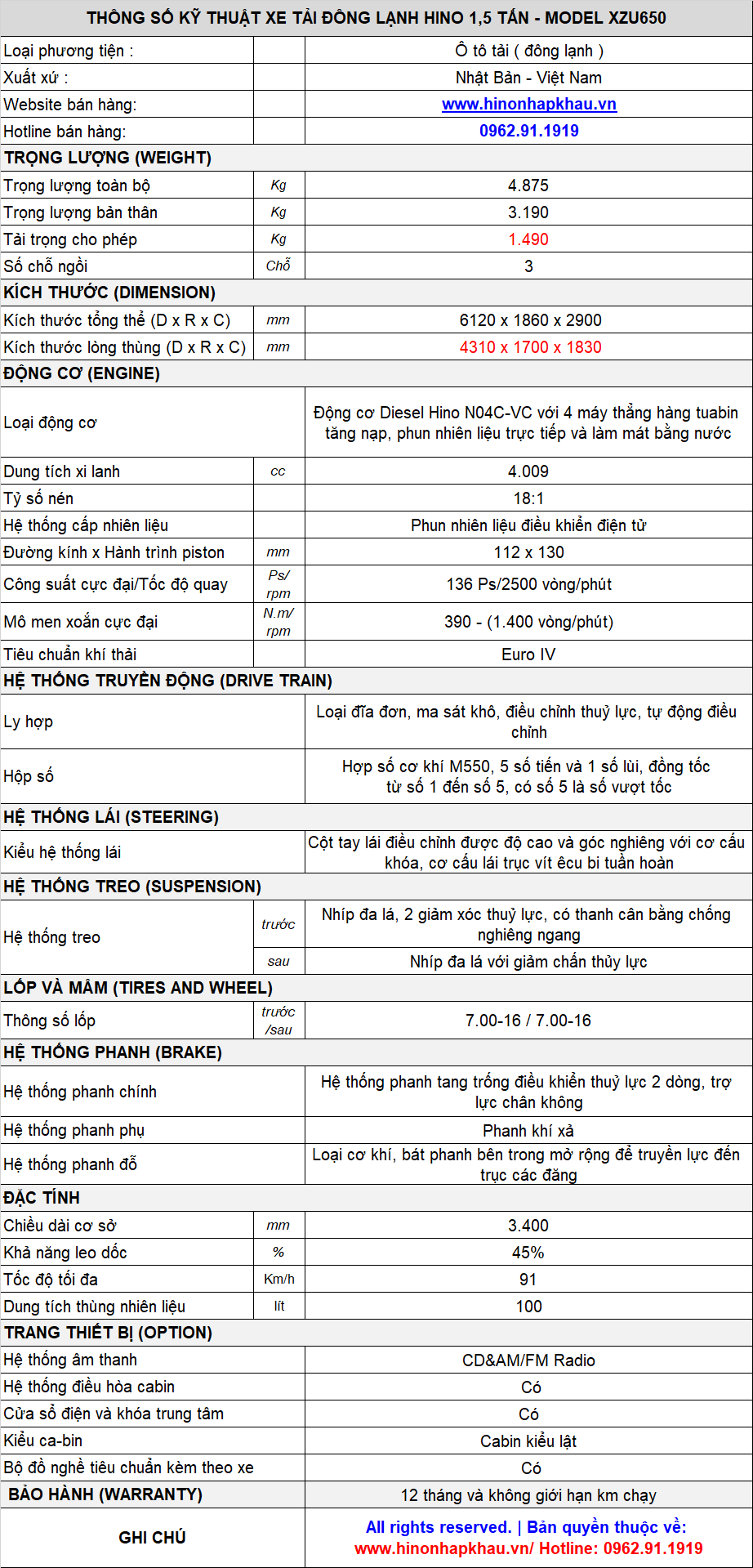 * THÔNG SỐ KỸ THUẬT XE TẢI HINO XZU650 ĐÔNG LẠNH THÙNG DÀI 4.3M :