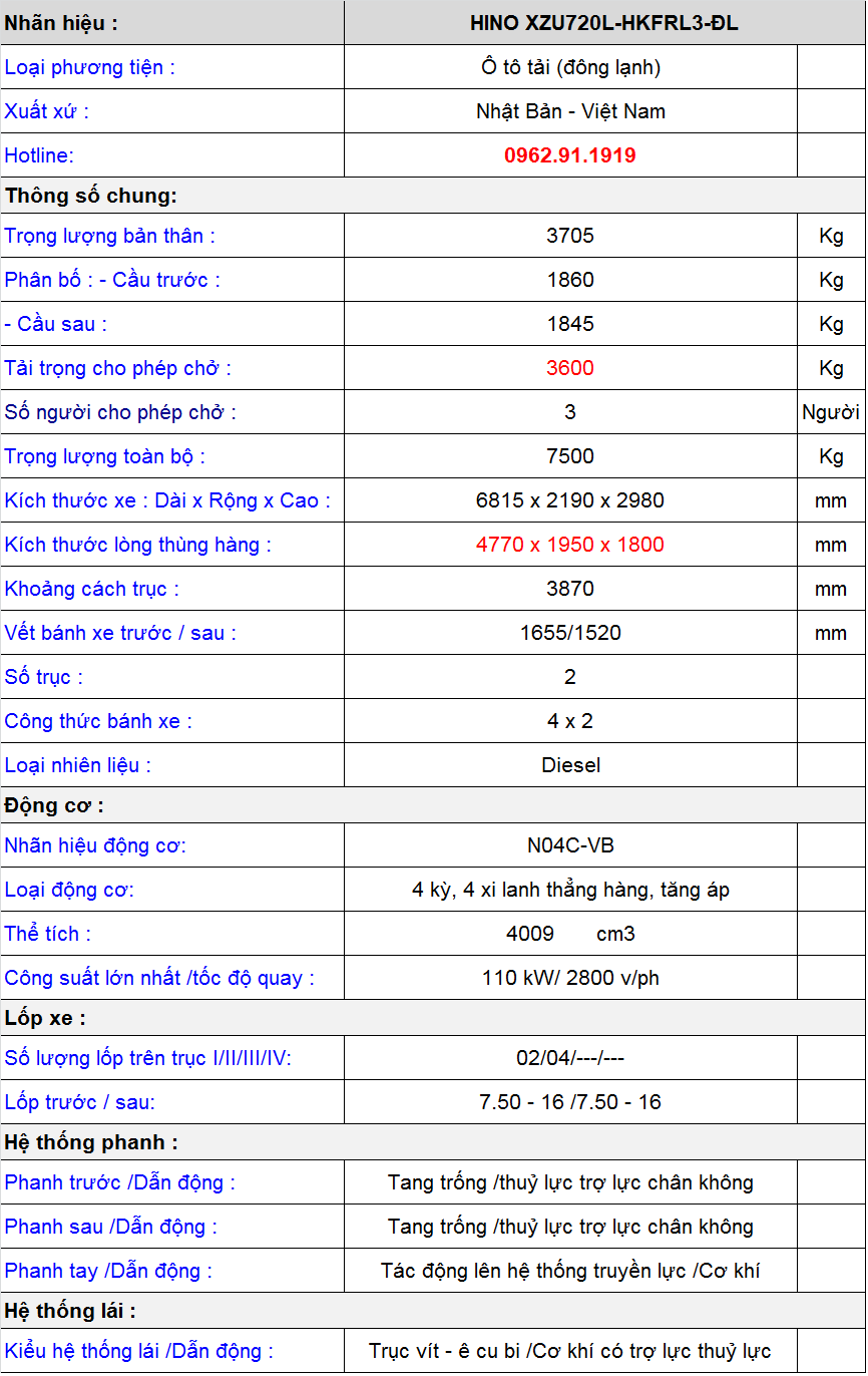 * THÔNG SỐ ĐẶC TÍNH KỸ THUẬT XE TẢI HINO ĐÔNG LẠNH 3.6 TẤN THÙNG DÀI 5M: