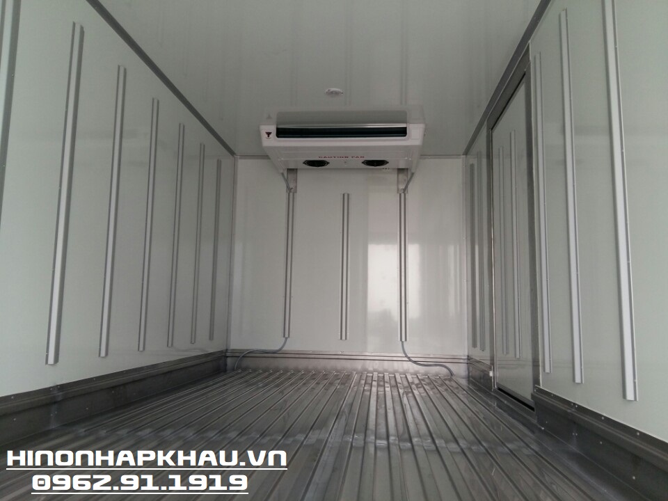 - Thùng đông lạnh 3 tấn Hino được gia công bằng vật liệu tiên tiến với 3 lớp cách nhiệt, tấm Panel thành, nóc, sàn thùng nhập khẩu về ép nóng cùng tấm cách nhiệt dày 76mm, gỗ.. Sàn thùng bên trong được gia cố bằng Inox 304 cứng chắc giúp cách nhiệt tối ưu kể cả trong điều kiện thời tiết bên ngoài > 30 độ.