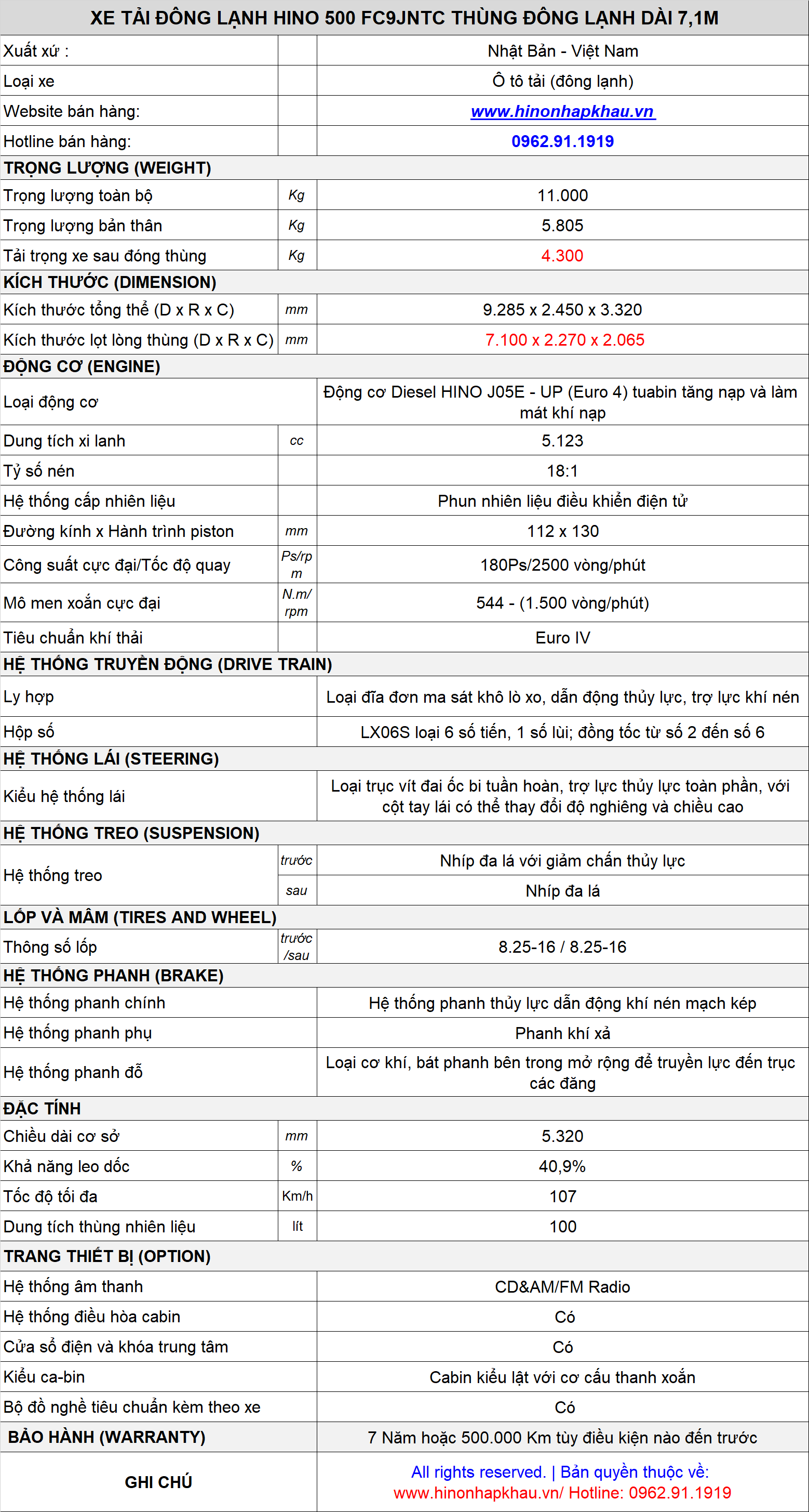 * THÔNG SỐ KỸ THUẬT XE TẢI ĐÔNG LẠNH HINO 500 FC9JN7A EURO V MÁY LẠNH DỜI HWASUNG THERMO: