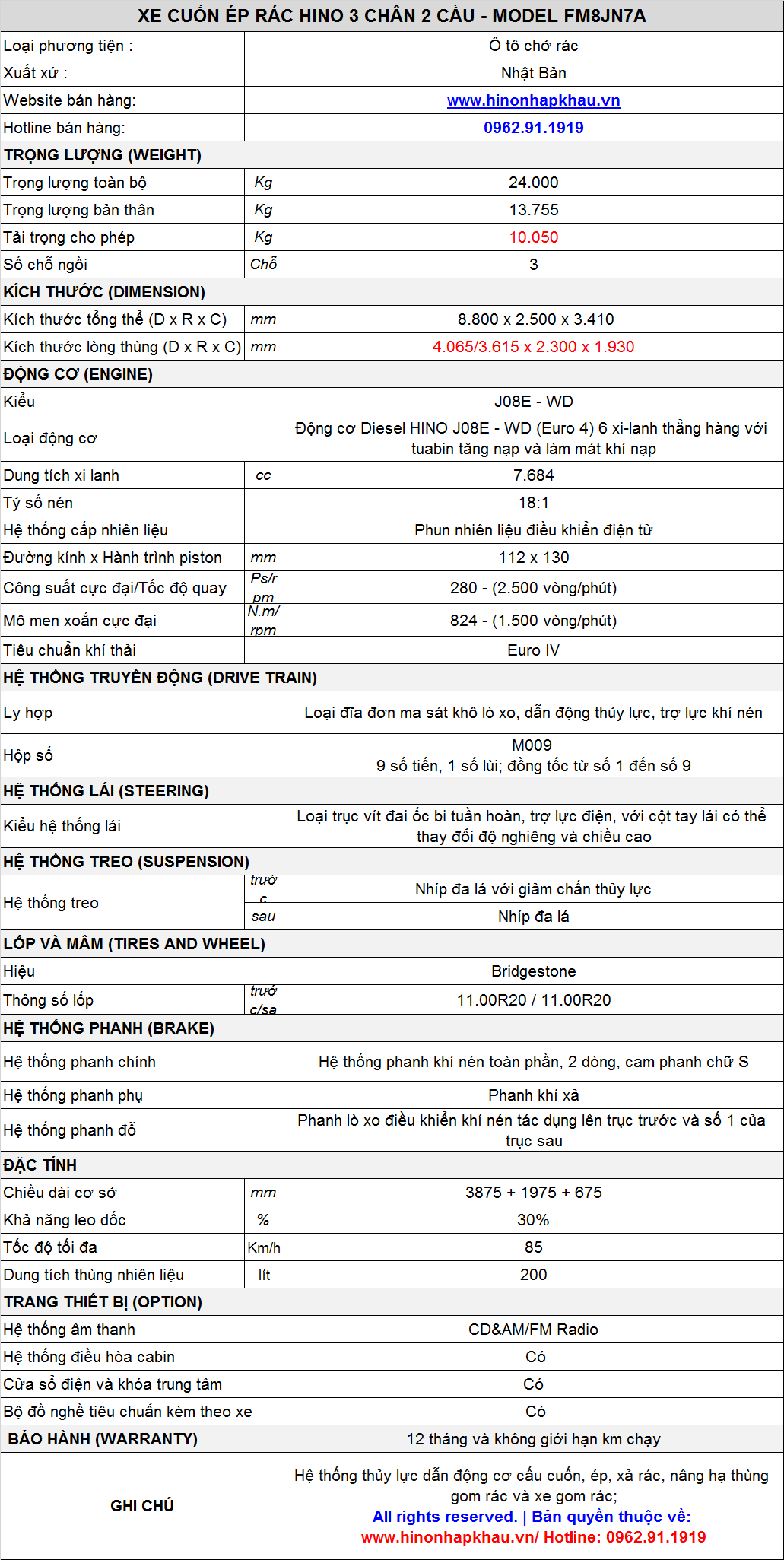 * THÔNG SỐ KỸ THUẬT XE ÉP RÁC 20M3 (20 KHỐI) HINO 3 CHÂN 6x4 FM8JN7A EURO 5: