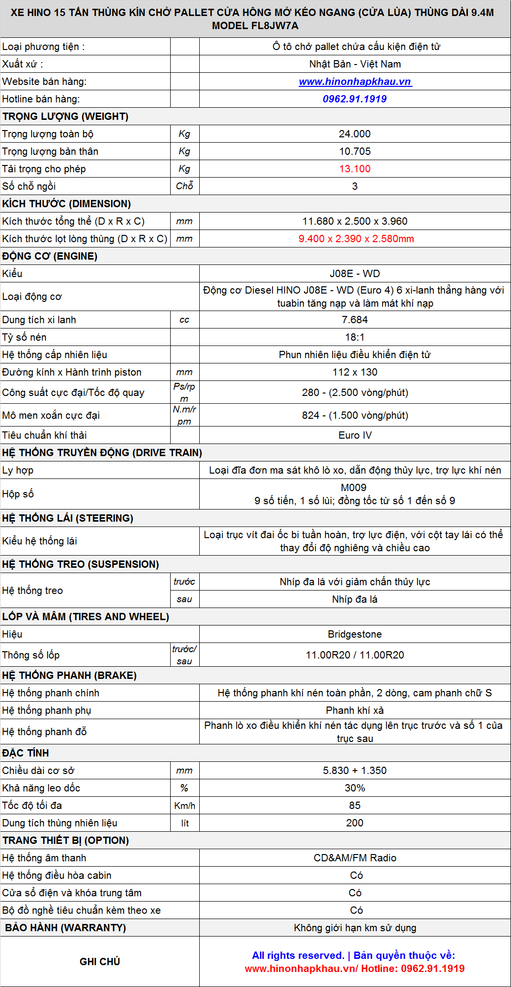 * THÔNG SỐ KỸ THUẬT CHI TIẾT XE Ô TÔ HINO 15T THÙNG KÍN PALLET CHỨA CẤU KIỆN ĐIỆN TỬ :