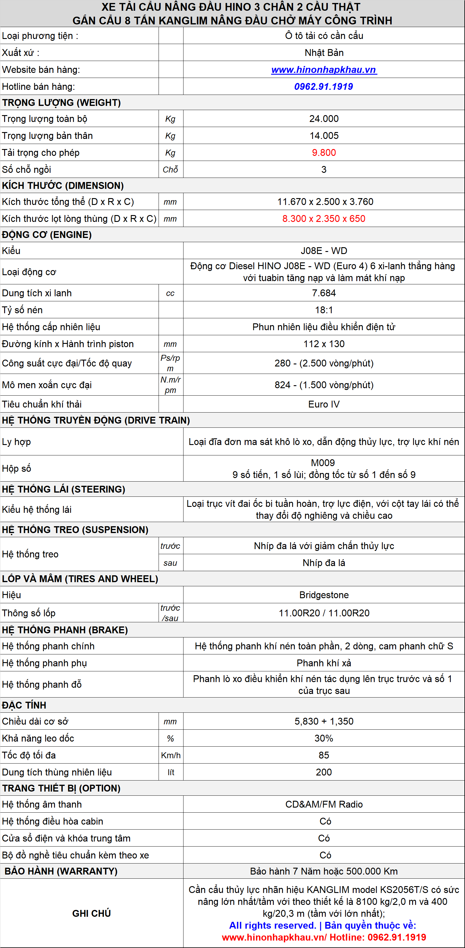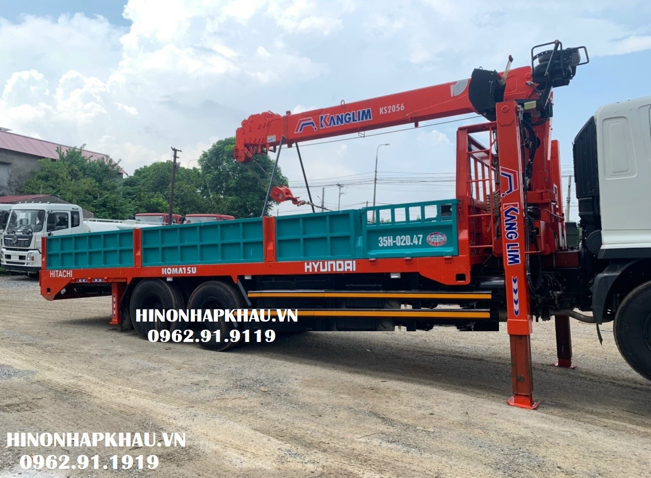 - Xe cẩu nâng đầu Hino FM8JW7A Euro V Lắp Cẩu Kanglim 8 Tấn có sàn chân nâng đầu chở máy là dòng xe tải hino 500 2 cầu thật tổng tải 24 tấn thiết kế 2 cầu lắp cẩu tự hành Kanglim 8 tấn model KS2056H và hệ thống chân cao nâng đầu sàn chở máy công trình chất lượng cao được sử dụng rộng rãi hiện nay. Xe cẩu nâng đầu Kanglim KS2056 gắn hino 3 chân FM8JW7A là mẫu xe được thiết kế với 2 cầu chủ đông, xe có công thức bánh là 6 x4 duy nhất trong phân khúc xe cẩu nâng đầu hàng cao cấp Nhật Bản Hàn Quốc.