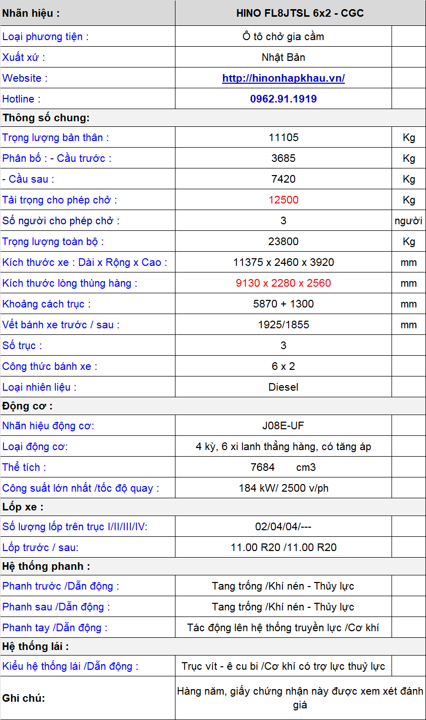 * THÔNG SỐ KỸ THUẬT XE CHỞ GIA CẦM HINO 500 FL::