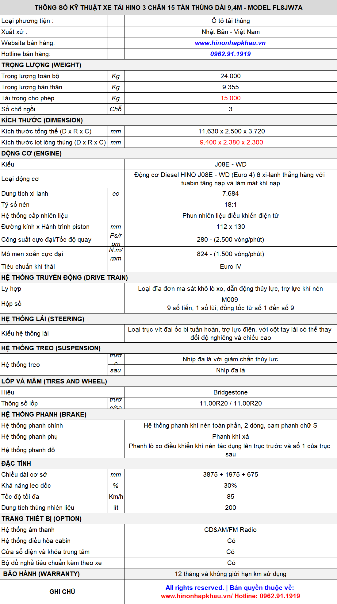 * THÔNG SỐ KỸ THUẬT CHI TIẾT XE TẢI HINO 3 CHÂN EURO 5 THÙNG DÀI 9.4M CẦU LÔI :