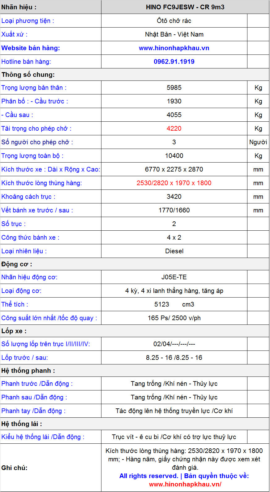 * Thông số kỹ thuật xe Hino FC9JESW cuốn ép rác 9m3: