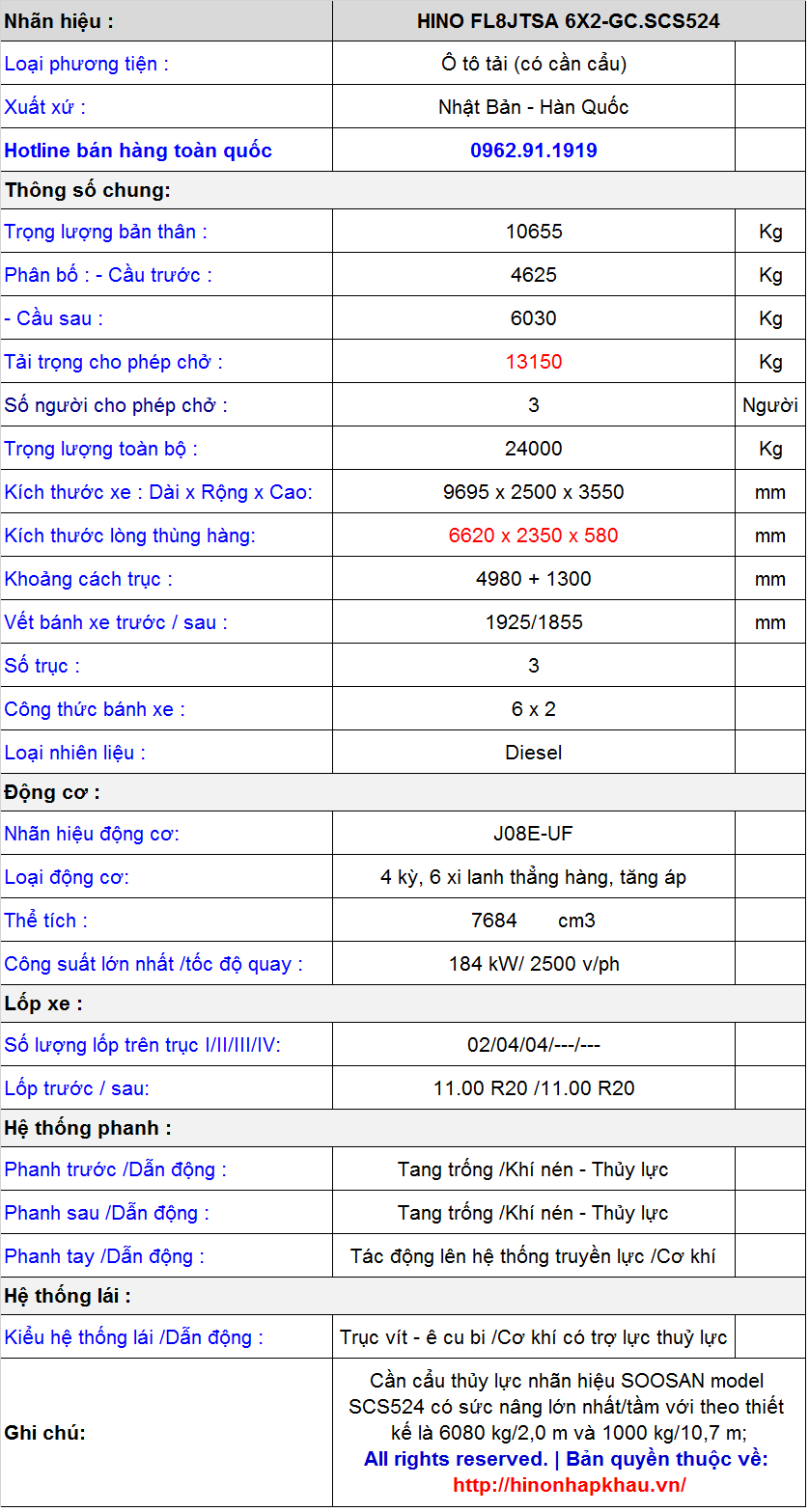 * Thông số kỹ thuật xe tải Hino 16 tấn gác cẩu Soosan 6,1 tấn SCS524: