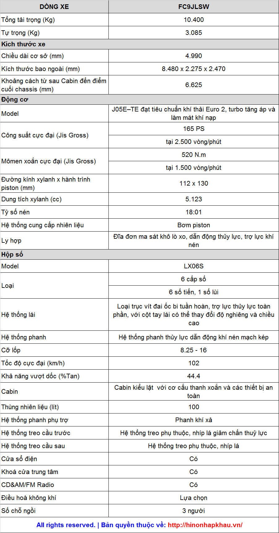 *Thông số kỹ thuật của Xe tải Hino 6 tấn FC9JLSW: