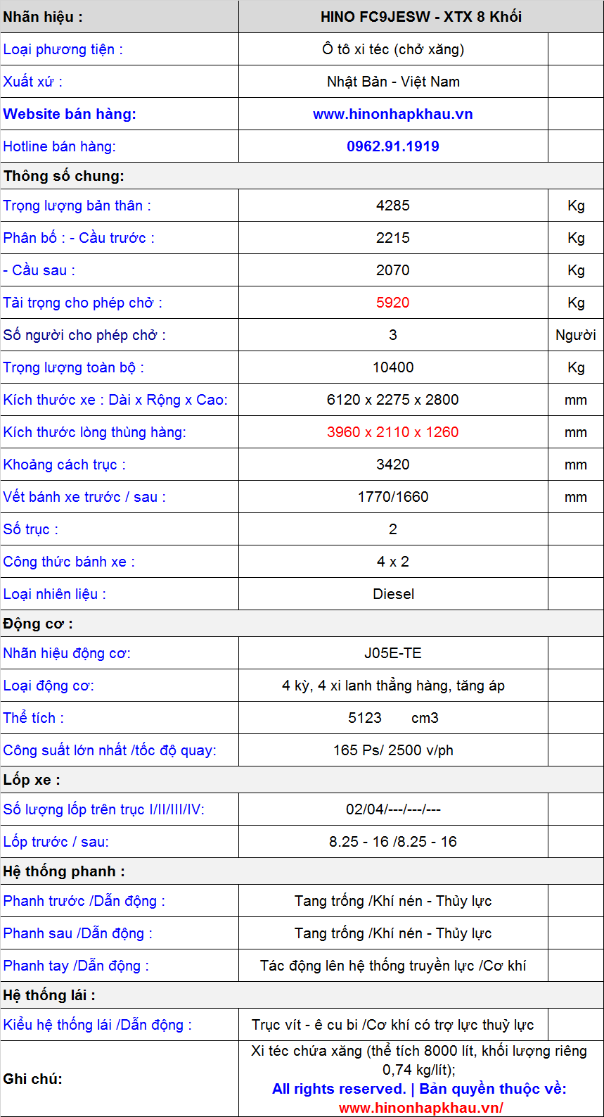 * Thông số kỹ thuật xe xi téc Hino FC9JESW chở xăng 8 khối: