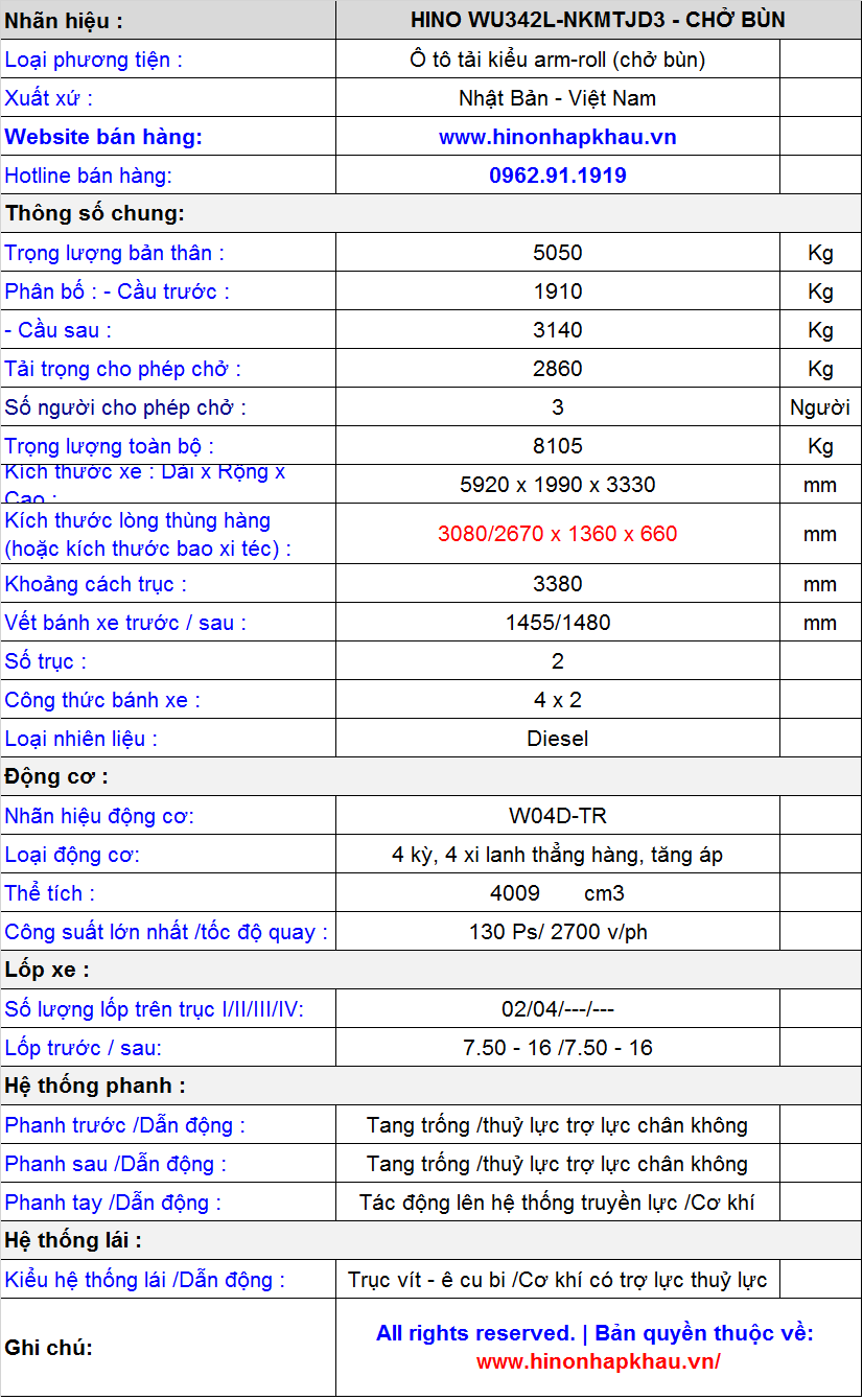 * THÔNG SỐ KỸ THUẬT XE TẢI HINO DUTRO 300 CHỞ BÙN 2.7M3 ( 2.7 KHỐI):