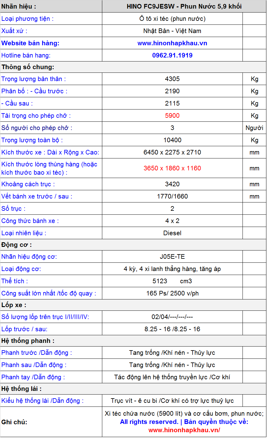 * Thông số kỹ thuật xe xi téc phun nước 6 khối Hino FC9JESW: