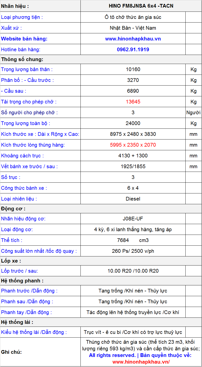 * THÔNG SỐ KỸ THUẬT XE TẢI HINO 3 CHÂN FM8JNSA CHỞ GIA THỨC ĂN GIA SÚC: