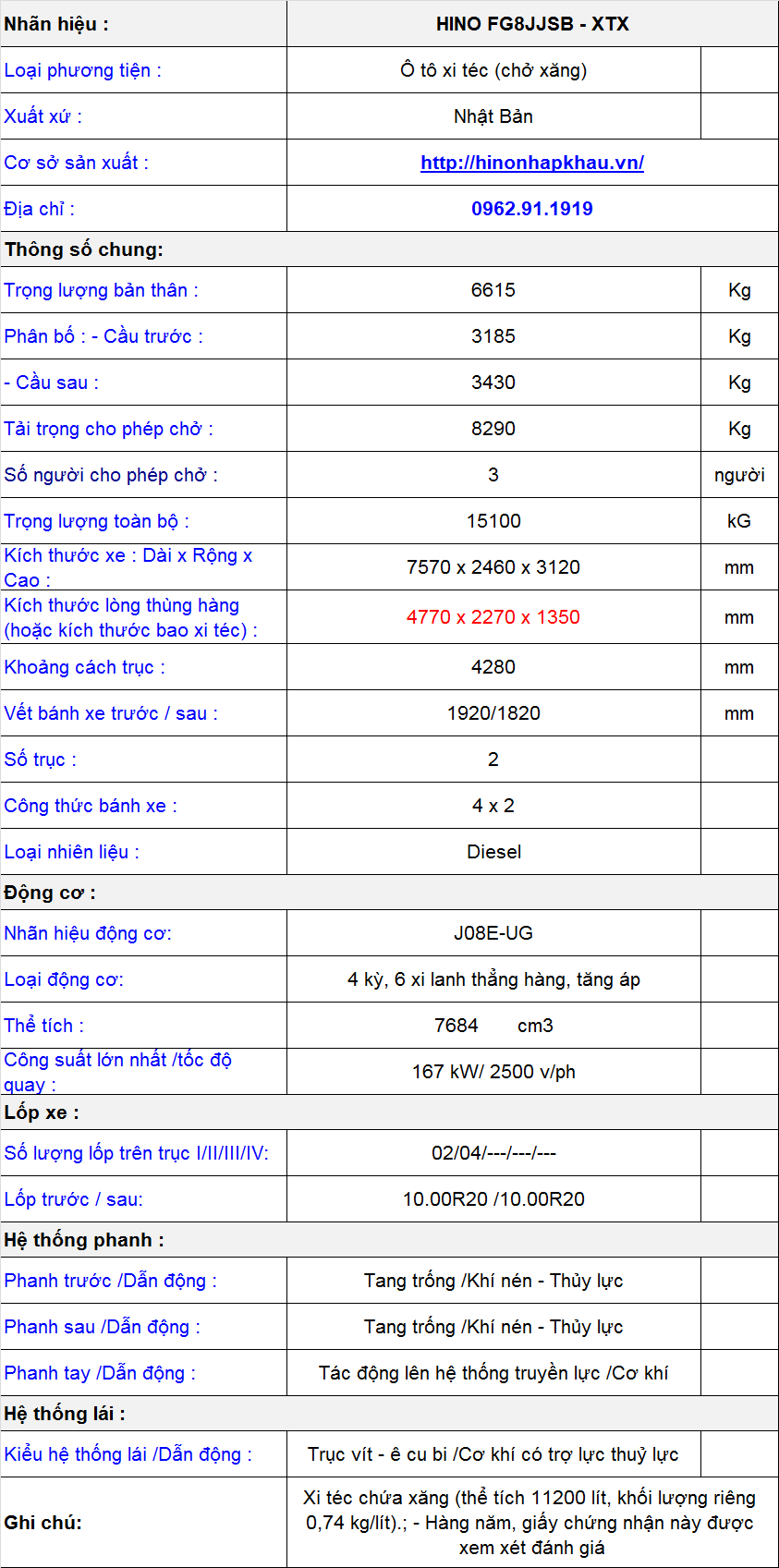 * Thông số kỹ thuật xe xi téc xăng Hino 11 khối: