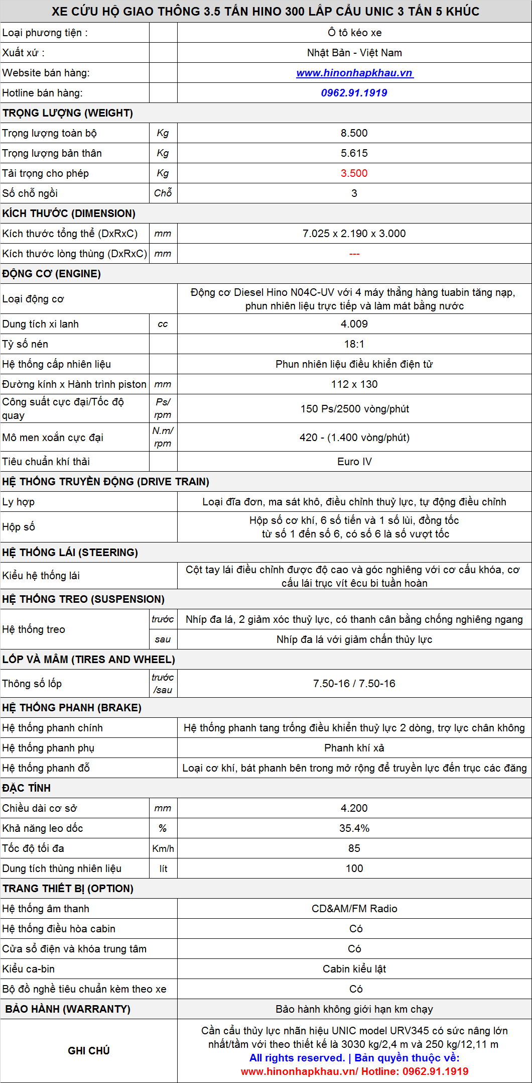 * THÔNG SỐ KỸ THUẬT XE CỨU HỘ GIAO THÔNG KÉO CẨU HINO GẮN CẨU UNIC 3 TẤN 5 ĐỐT URV345: