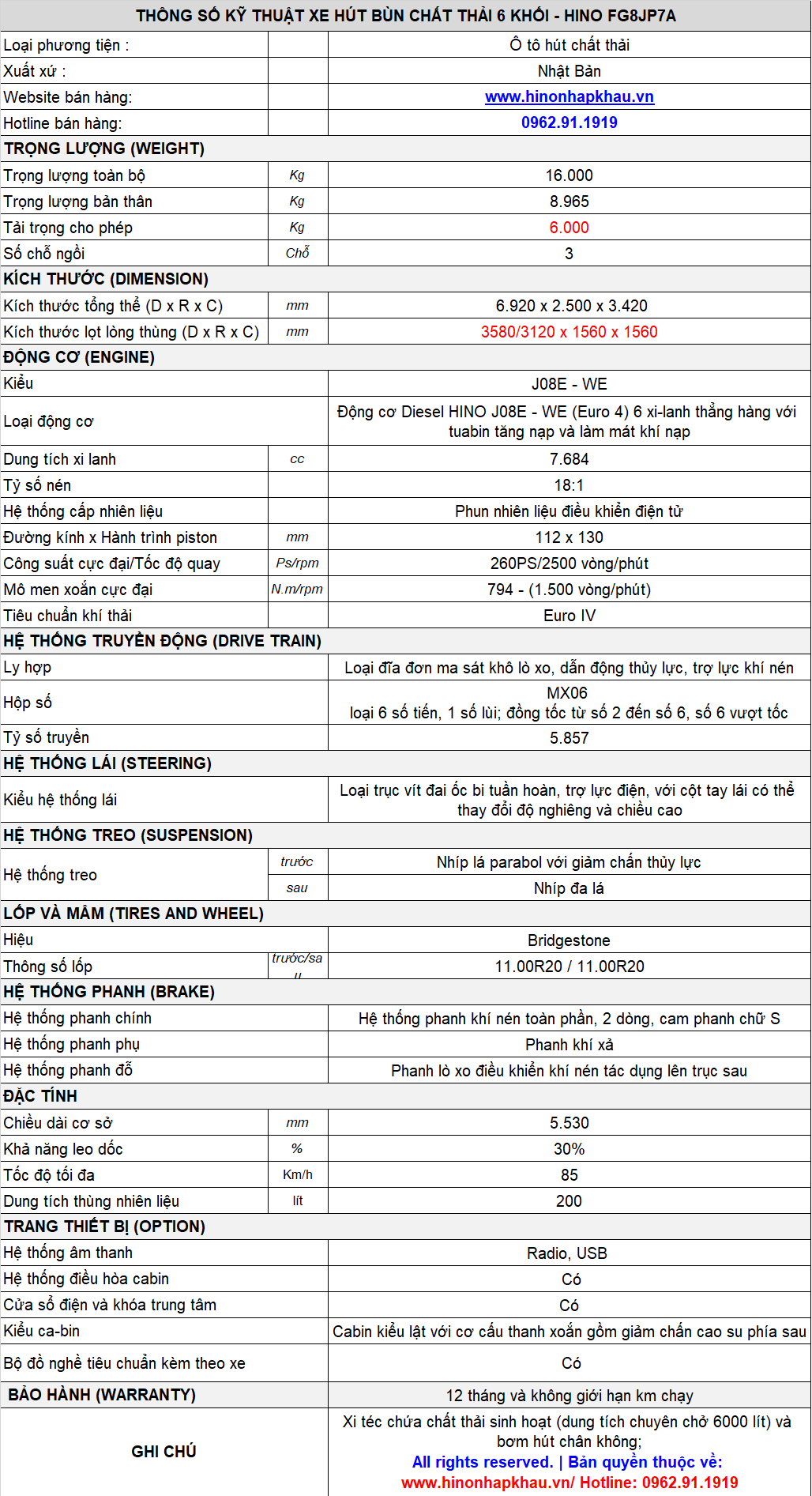* THÔNG SỐ KỸ THUẬT XE HÚT BÙN 6 KHỐI HINO FG8JJ8A EURO 5: