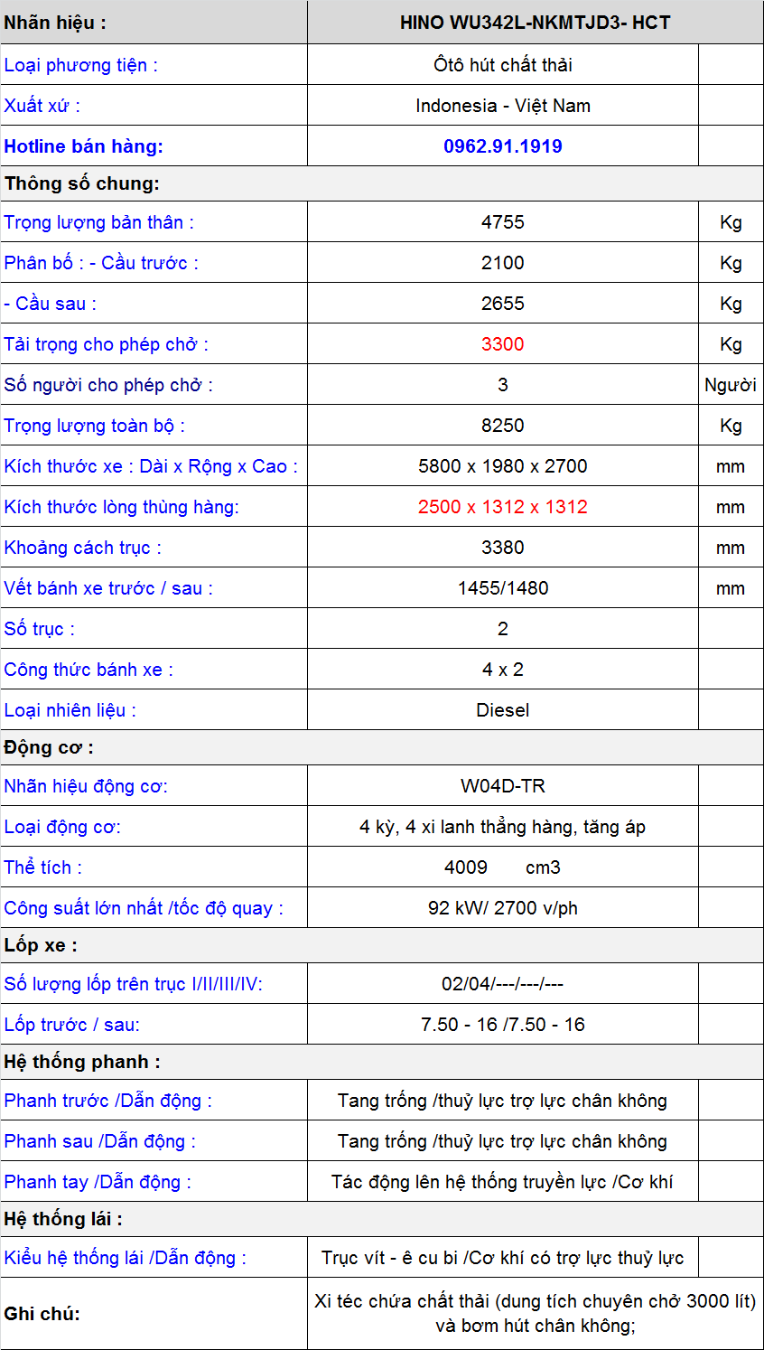 * THÔNG SỐ KỸ THUẬ XE HINO XZU342 HÚT CHẤT THẢI 3 KHỐI 3M3: