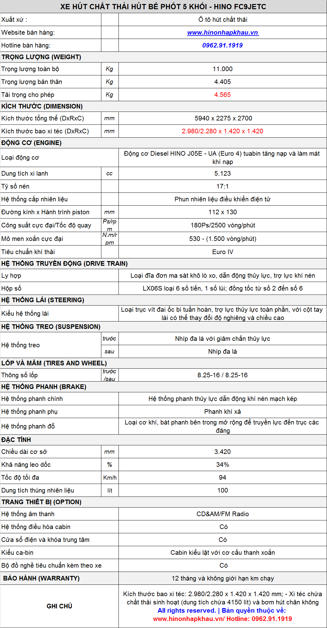 * THÔNG SỐ KỸ THUẬT Ô TÔ HÚT CHẤT THẢI 5 KHỐI(5M3) HINO FC9JE8A E5 PHIÊN BẢN 2026 - 2027 :