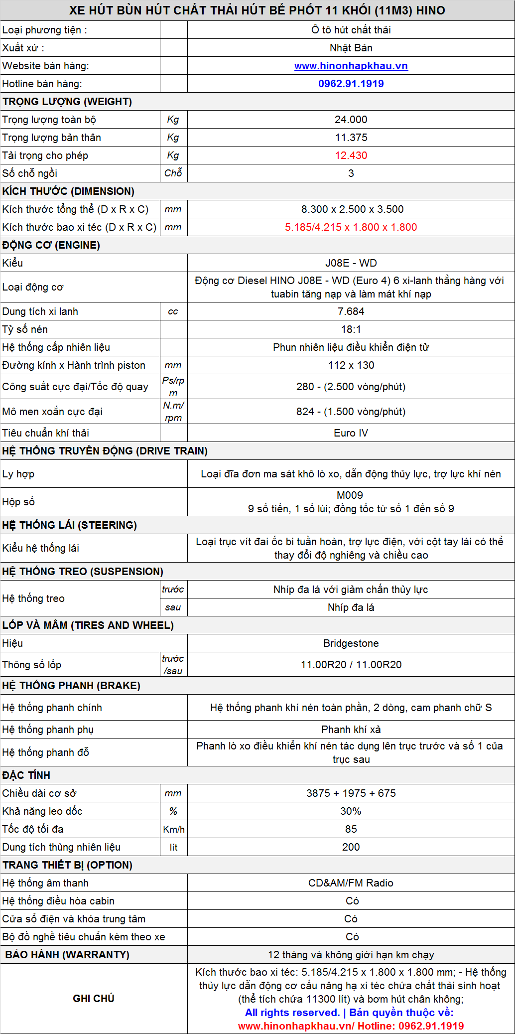 - Xuất xứ: Linh kiện nhập khẩu 3 cục đồng bộ từ nhà máy Hino Motors Nhật Bản, lắp ráp tại nhà máy Hino Motors Việt Nam. Hệ thống chuyên dùng hút chất thải 15 tấn (11m3) hino được sản xuất tại Việt Nam với vật liệu, thiết bị nhập khẩu Nhật Bản và Italia.
