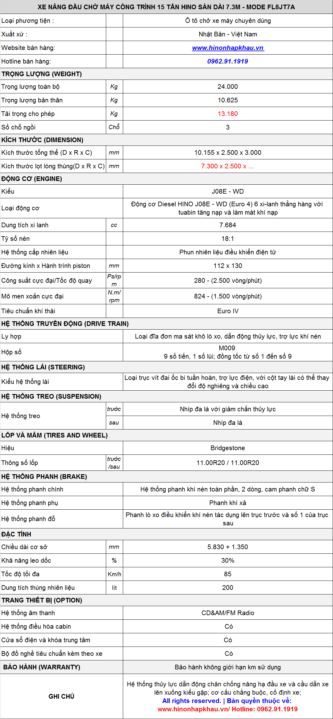 * THÔNG SỐ KỸ THUẬT XE HINO 15 TẤN CHỞ MÁY XÚC, MÁY XÂY DỰNG CÔNG TRÌNH - MODEL FL8JT8A EURO 5: