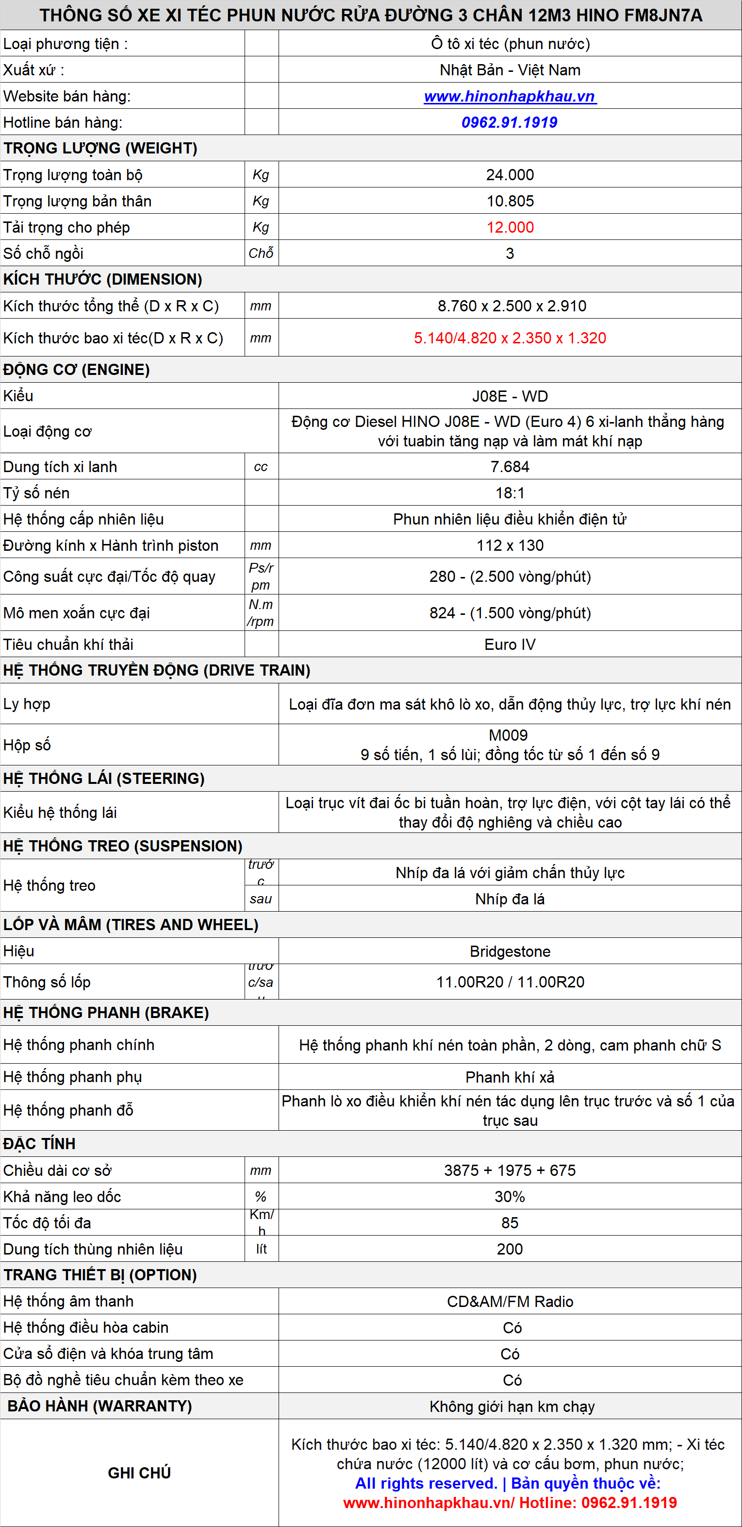 * THÔNG SỐ KỸ THUẬT XE XI TÉC PHUN NƯỚC RỬA ĐƯỜNG 3 CHÂN 2 CẦU HINO 500 FM8JN8A E5 ĐỜI 2026 - 2027: