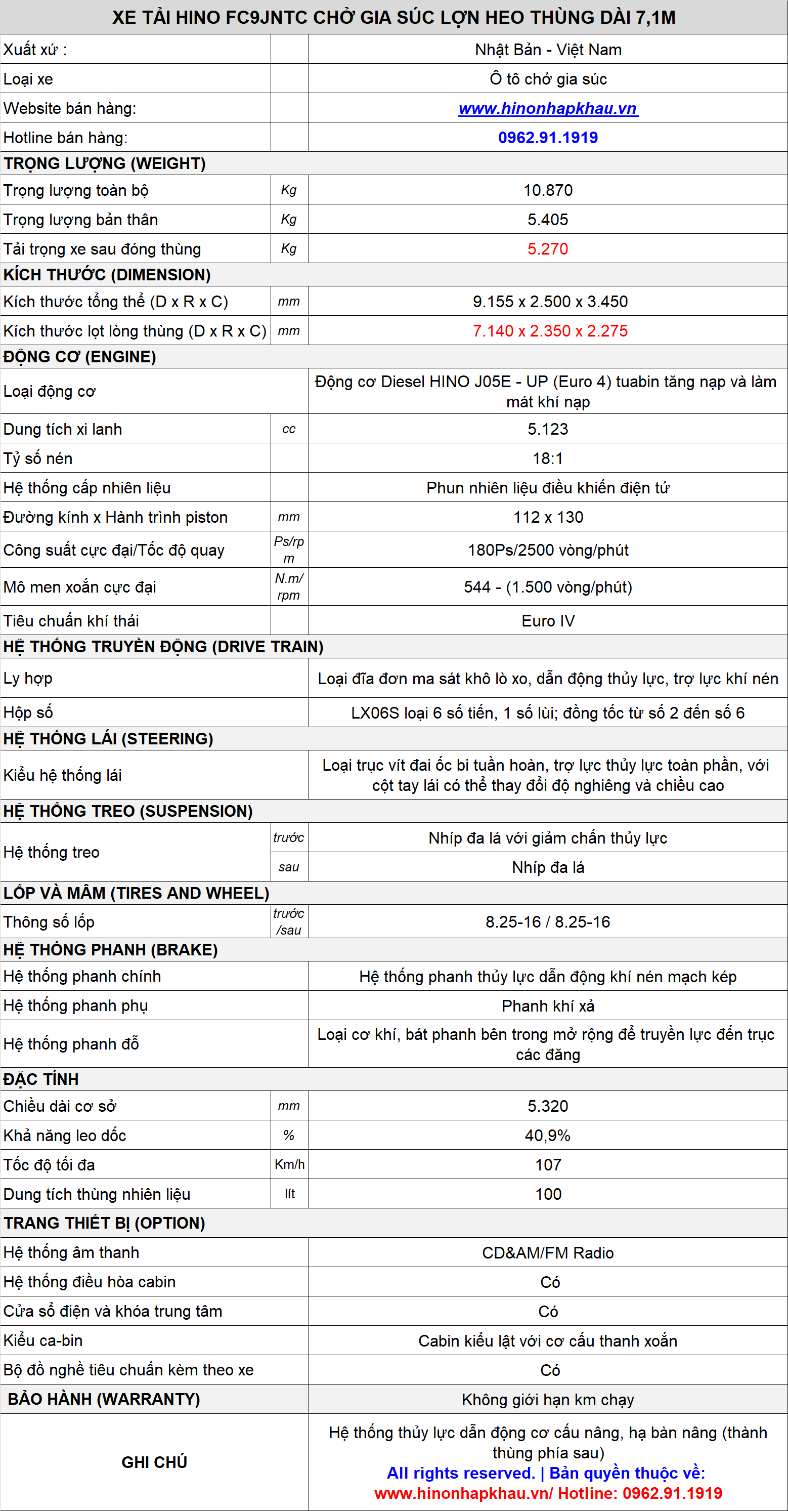 * Dòng sản phẩm ''XE HINO FC9JN7A CHỞ GIA SÚC LỢN HEO'' được bảo hành chính hãng 7 năm tại tất cả các đại lý ủy quyền của Hino Motors trên toàn quốc.