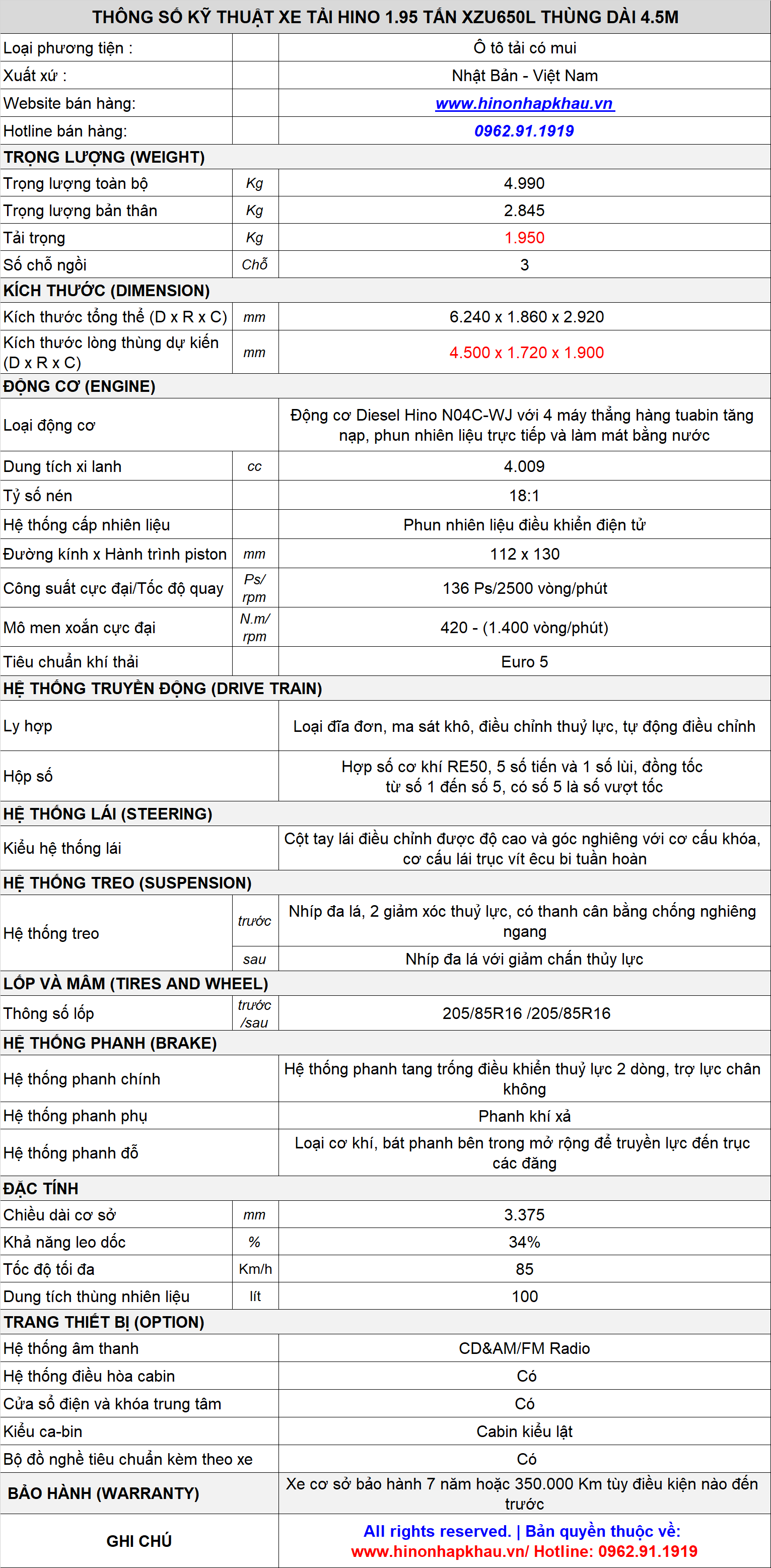 * THÔNG SỐ KỸ THUẬT XE TẢI MUI BẠT 1.95 TẤN HINO XZU650L: