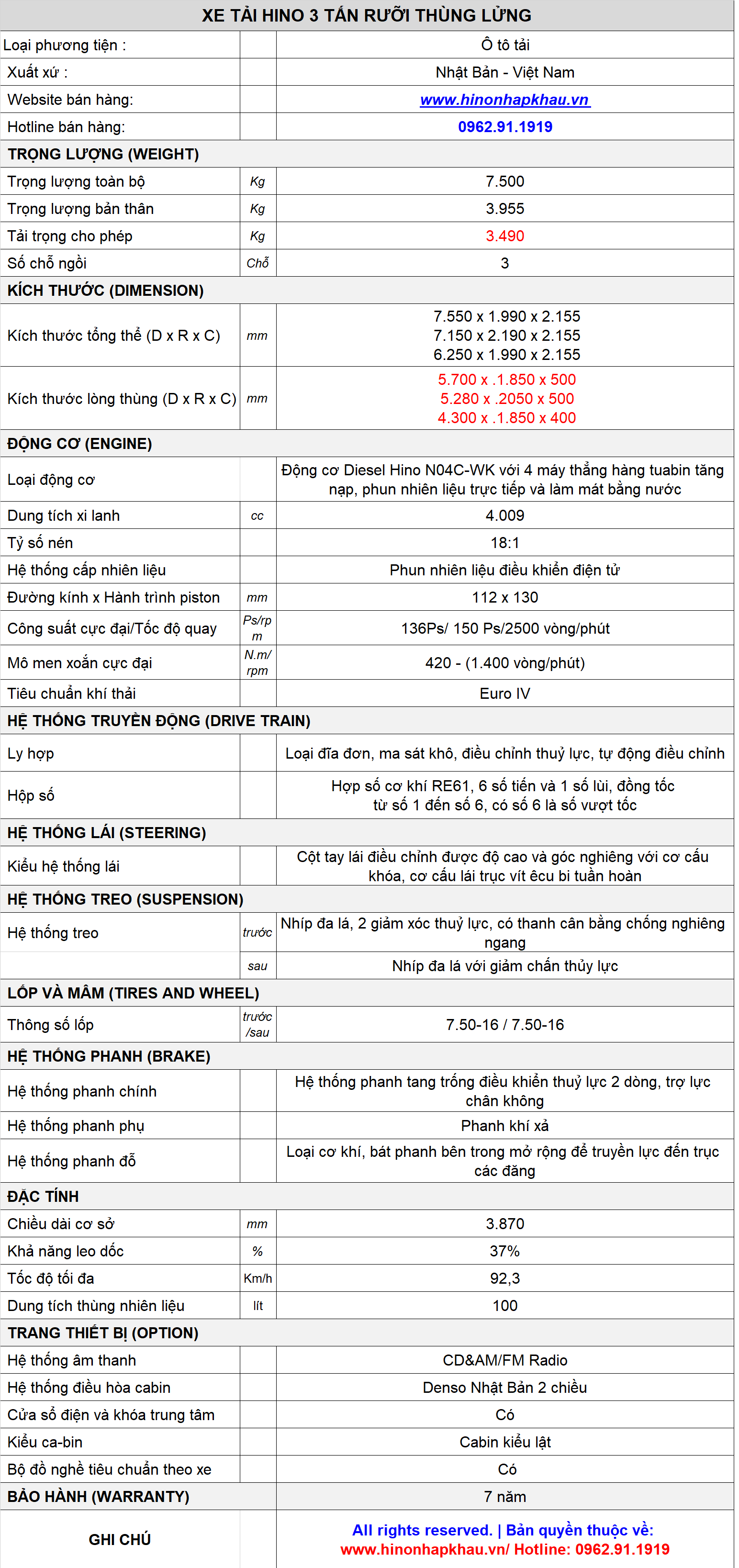 * THÔNG SỐ KỸ THUẬT XE TẢI HINO 3.5 TẤN THÙNG LỬNG ĐỜI 2026 - 2027: