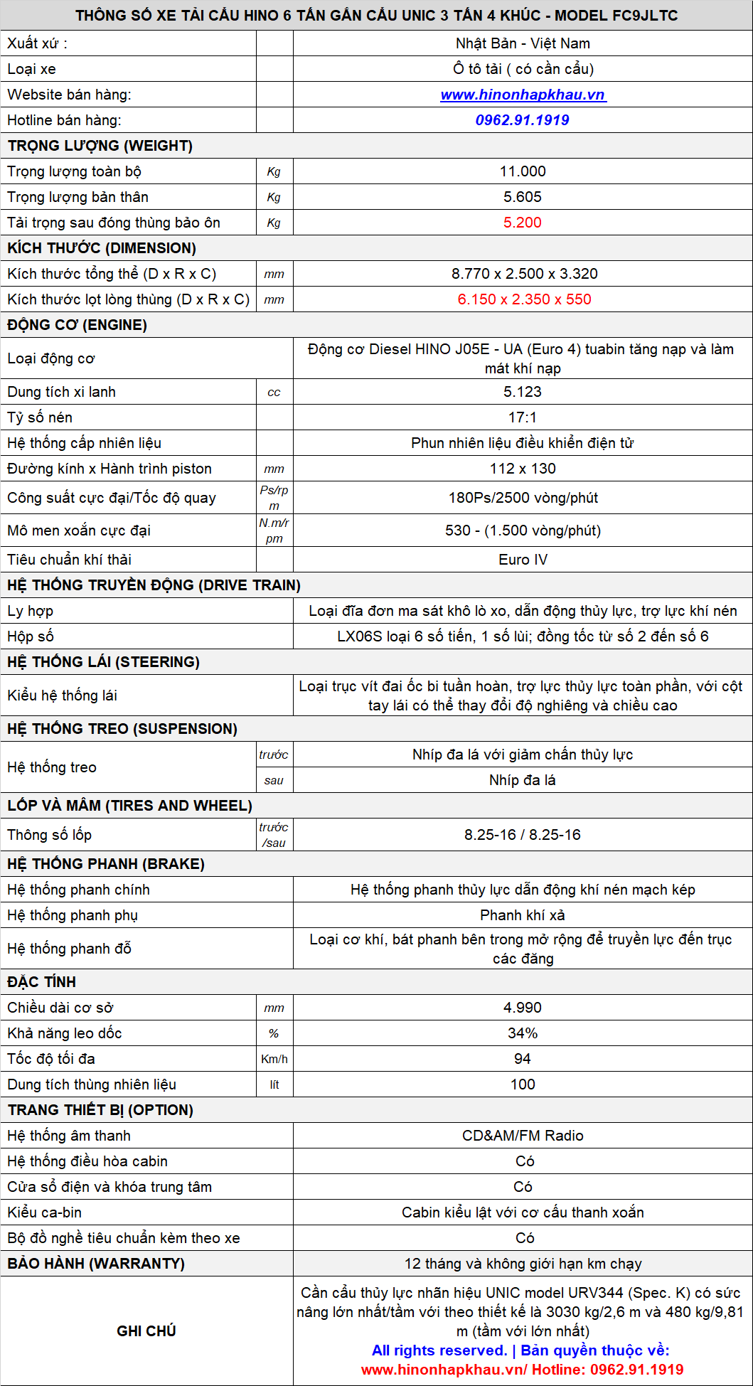 - ''Xe cẩu Hino FC gắn cẩu UNIC 3 tấn'' dòng xe tải cẩu thuộc Series FC 500 của Hino gắn cẩu tự hành hạng nhẹ với ưu thế kích thước lọng lòng thùng dài 6,15m sau gắn cẩu rất phù hợp chuyên chở cây sắt thép, ống, cột, xây lắp dựng nhà xưởng... Kết xe cẩu thùng Hino 6 tấn chắc chắn với đà dọc và đà ngang bằng Uduc, riêng đà ngang được đan thêm đà gỗ, sàn bằng gỗ dày 2,5cm bên trên phủ lớp tôn đen 2,5mm. Bao sàn bằng thép chấn dày 3mm, khung xương thùng bằng hộp kẽm hoặc hộp đen, Inox theo yêu cầu của khách hàng. Vách bửng bằng thép dày 1.5mm.