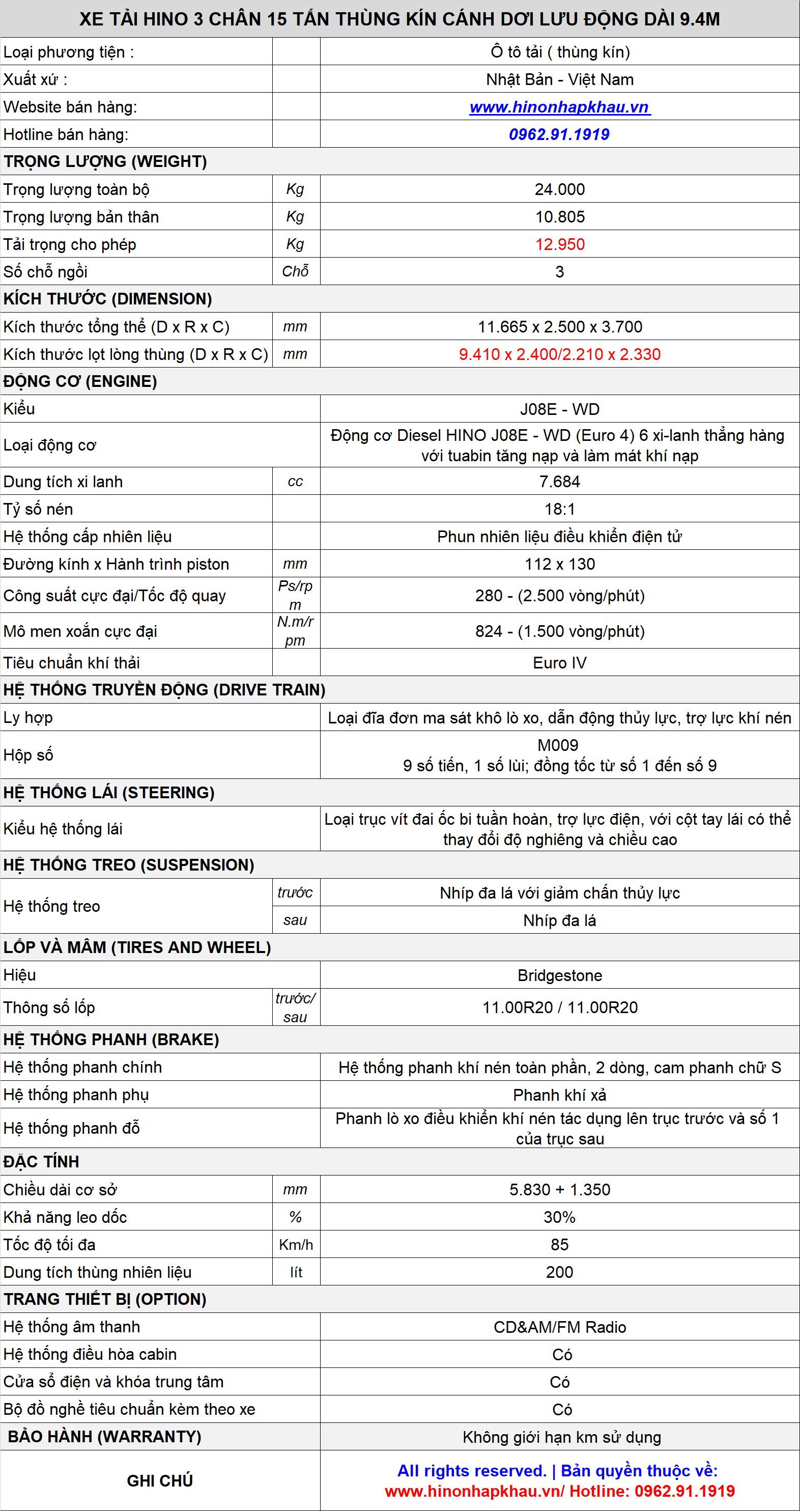 * THÔNG SỐ KỸ THUẬT XE TẢI HINO 3 CHÂN 15 TẤN THÙNG CÁNH DƠI LƯU ĐỘNG DÀI 9.4M: