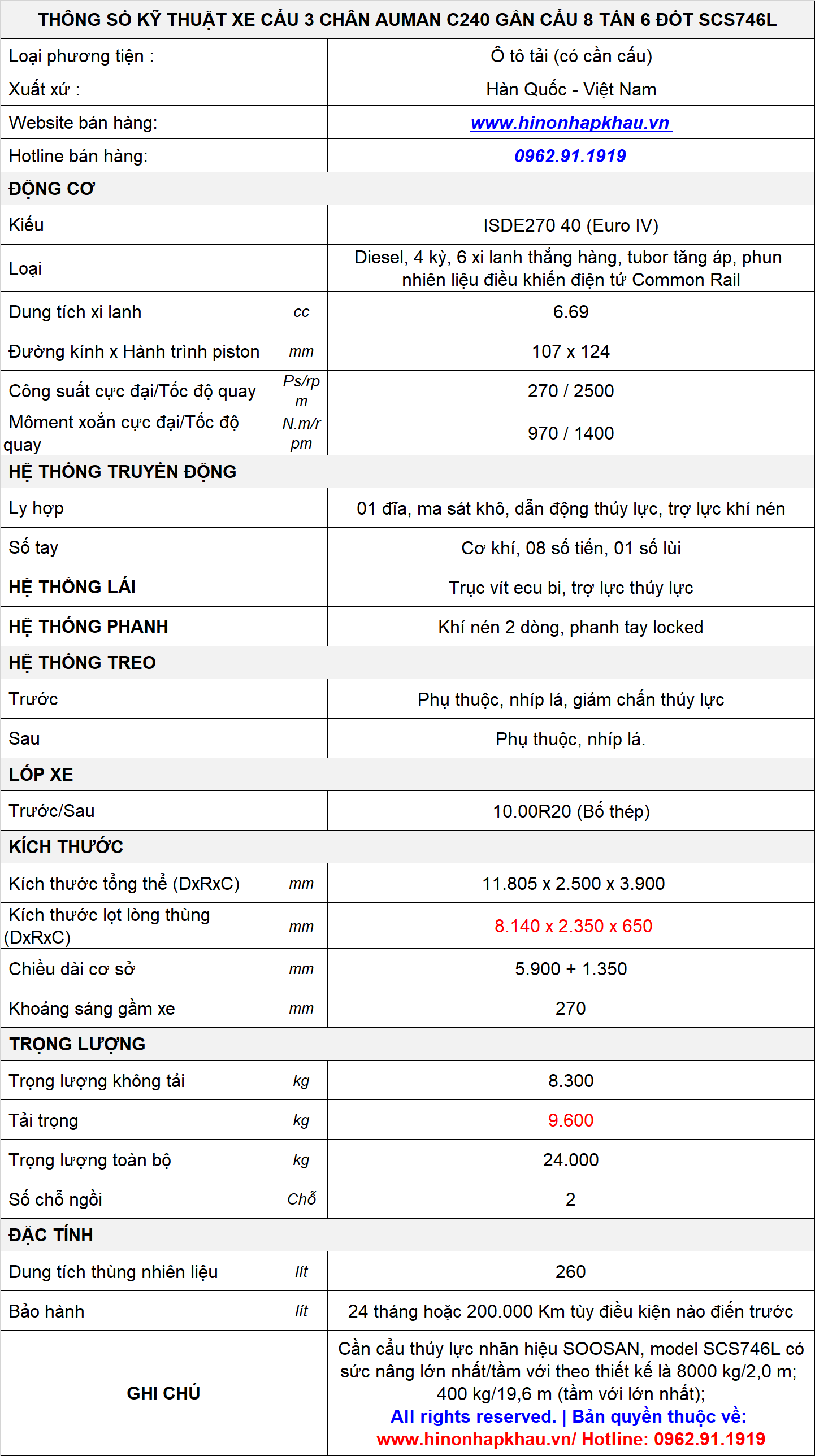 * THÔNG SỐ KỸ THUẬT XE CẦN CẨU 3 CHÂN AUMAN C240 GẮN CẨU 8 TẤN SOOSAN SCS746L ĐỜI 2021 - 2022: