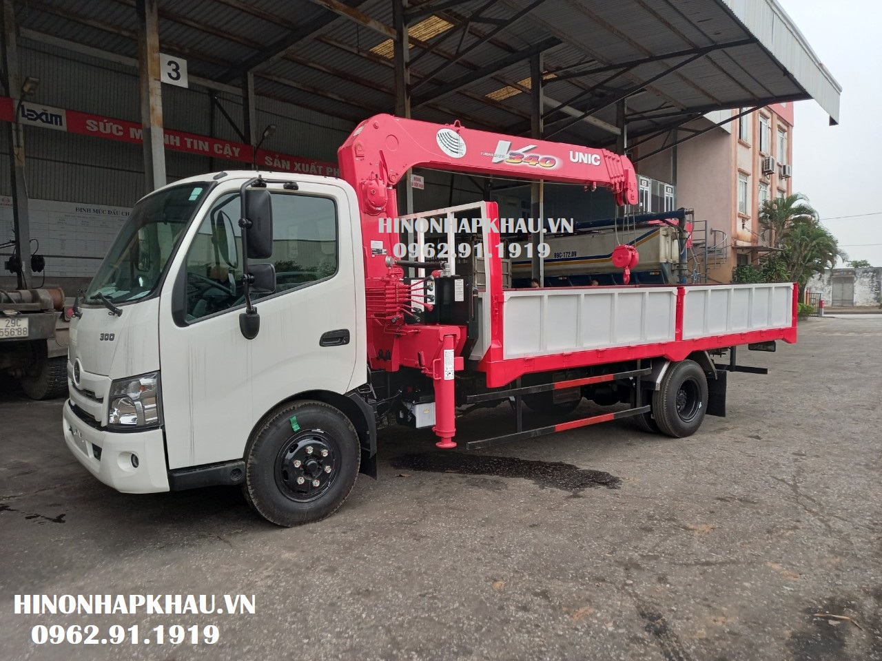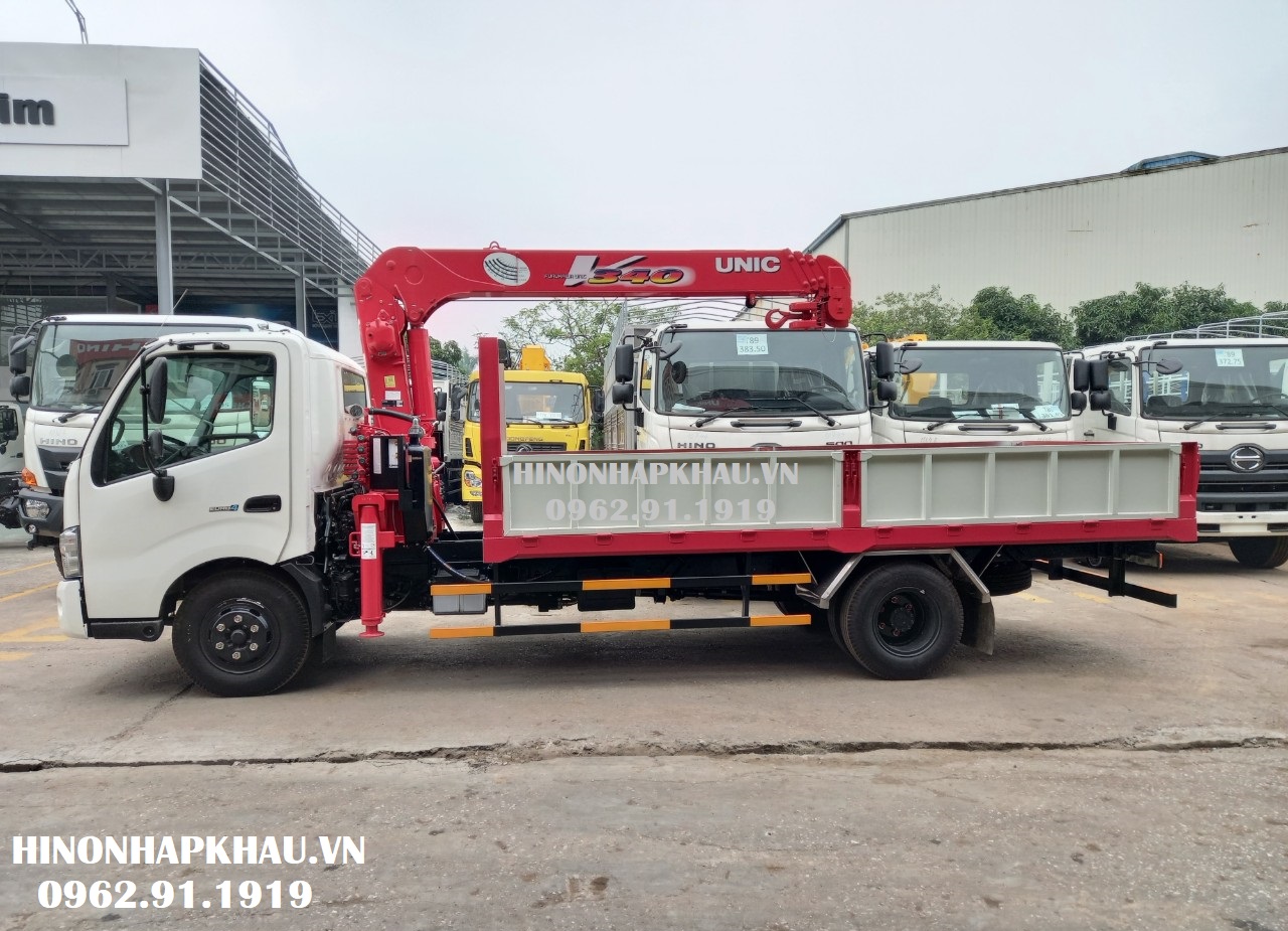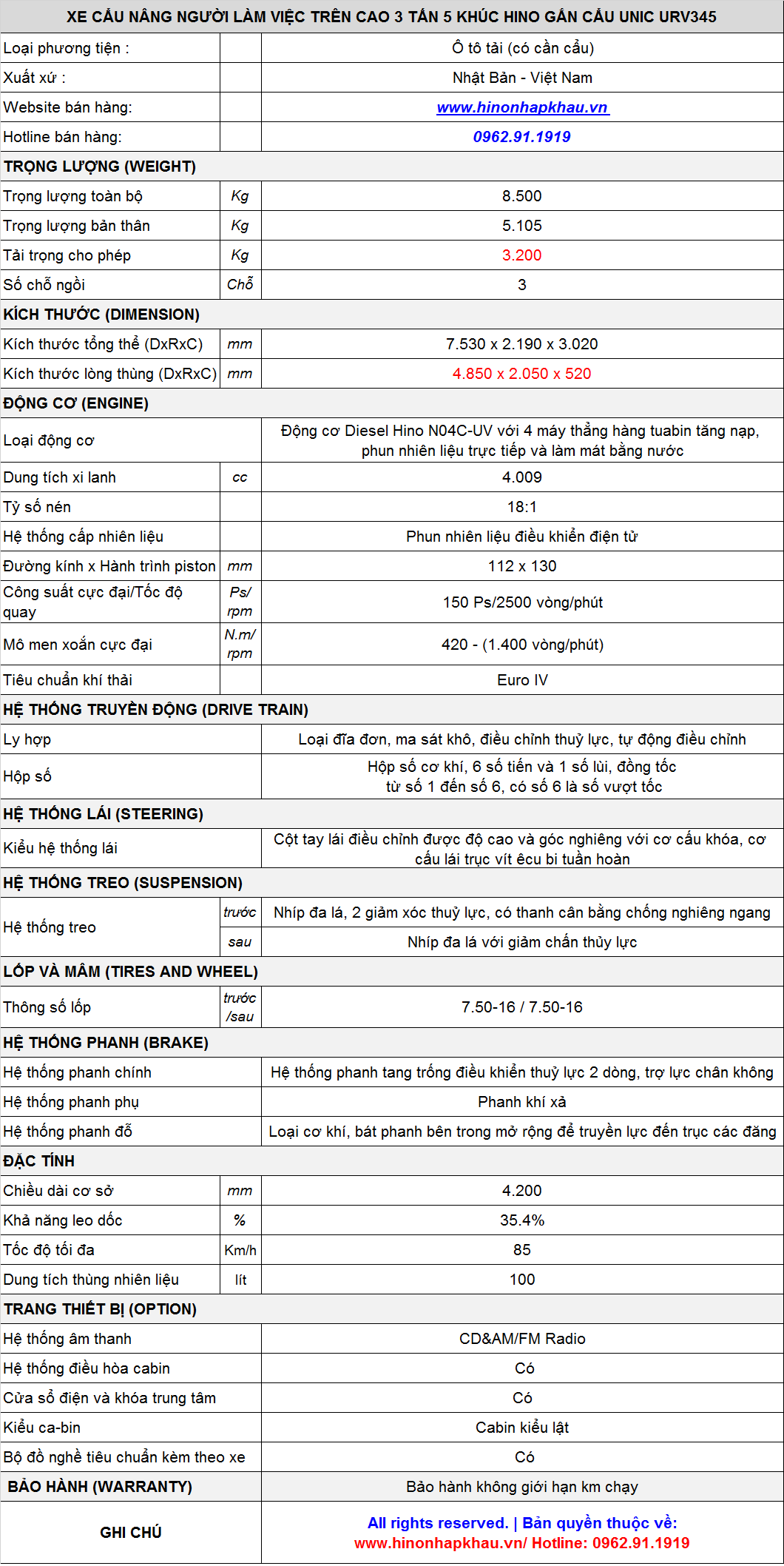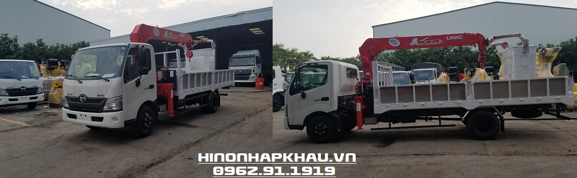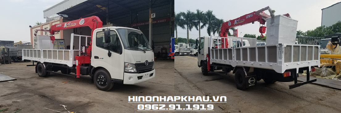 - Xe cẩu 3 tấn nâng người làm việc trên cao 13m Hino được trang bị cẩu Unic 3 tấn 5 khúc sản xuất tại Nhật Bản và nhập khẩu nguyên chiếc từ Nhật Bản có sức nâng tối ta là 3030 tấn tại độ cao 2,4m, với chiều cao móc tối đa là 13,7m, bán kính làm việc tối đa là 12,11m với góc xoay cần liên tục 360 độ, chiều dài ra cần tối đa là 12,5m, tối thiểu là 3,54m với góc nâng cầu từ 1 đến 78 độ, có 2 chân chống trước được sản xuất từ hãng, và 2 chân chống sau do Việt Nam sản xuất.