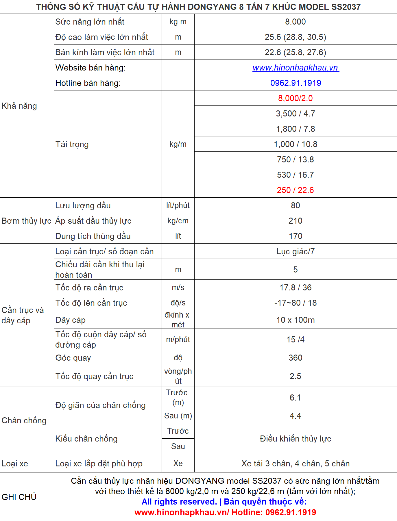 Với thương hiệu và chất lượng đã được khẳng định trên thị trường Việt Nam cũng như trên toàn thế giới, cùng với dịch vụ chăm sóc hậu mãi sau bán hàng, dịch vụ bảo dưỡng, chăm sóc uy tín chất lượng cao. ''XE CẨU 8 TẤN DONGYANG SS2037'' luôn luôn là " Sự lựa chọn hoàn hảo " cho tất cả mọi Khách hàng.