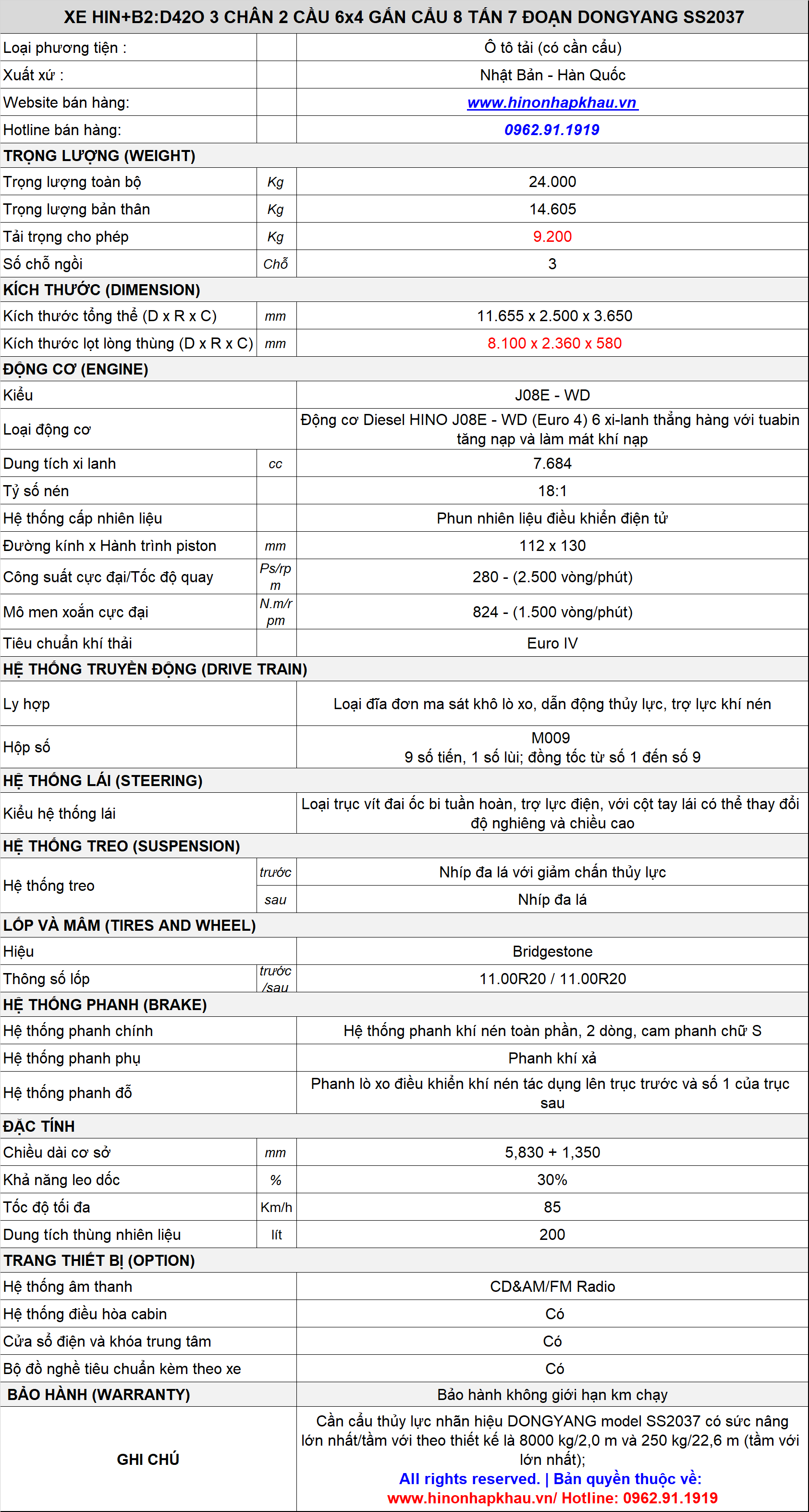 * THÔNG SỐ KỸ THUẬT XE CẨU 8 TẤN DONGYANG SS2037 GẮN TRÊN HINO 3 CHÂN 2 CẦU THẬT FM8JW7A ĐỜI 2021 - 2022: