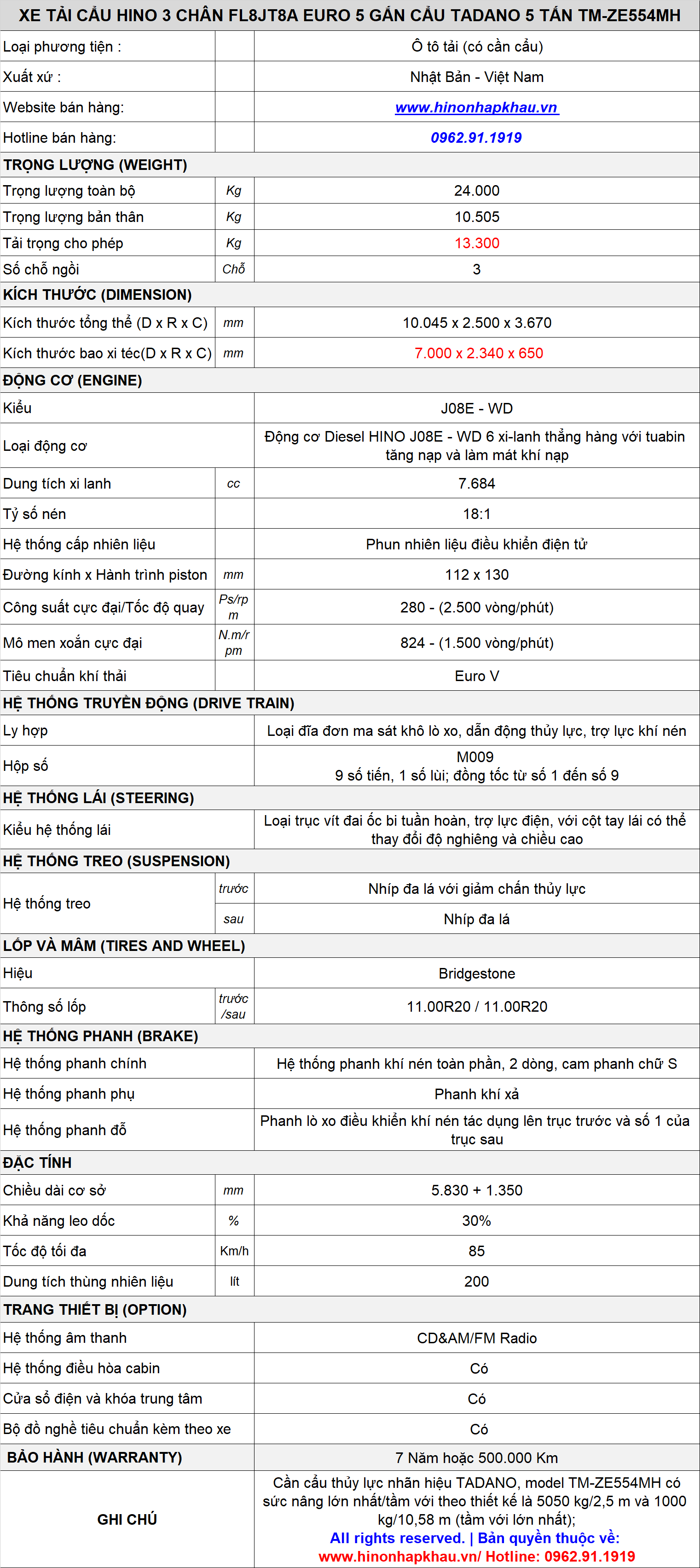 * THÔNG SỐ KỸ THUẬT XE TẢI CẨU TADANO 5 TẤN LẮP TRÊN HINO 15 TẤN FL8JT7A: