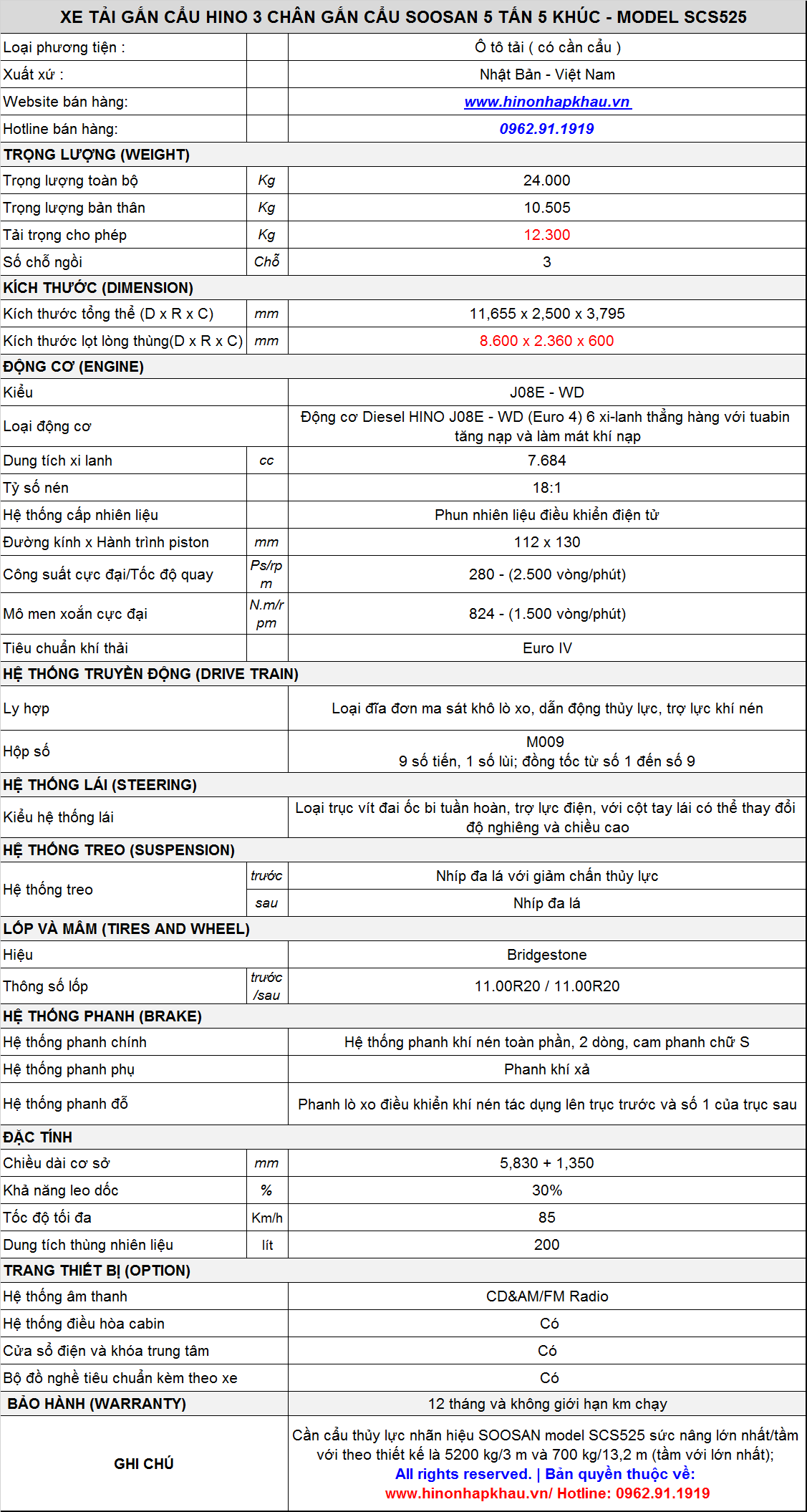 * THÔNG SỐ KỸ THUẬT XE TẢI HINO TỔNG TẢI 24 TẤN LẮP CẨU SOOSAN 5 TẤN 5 KHÚC :