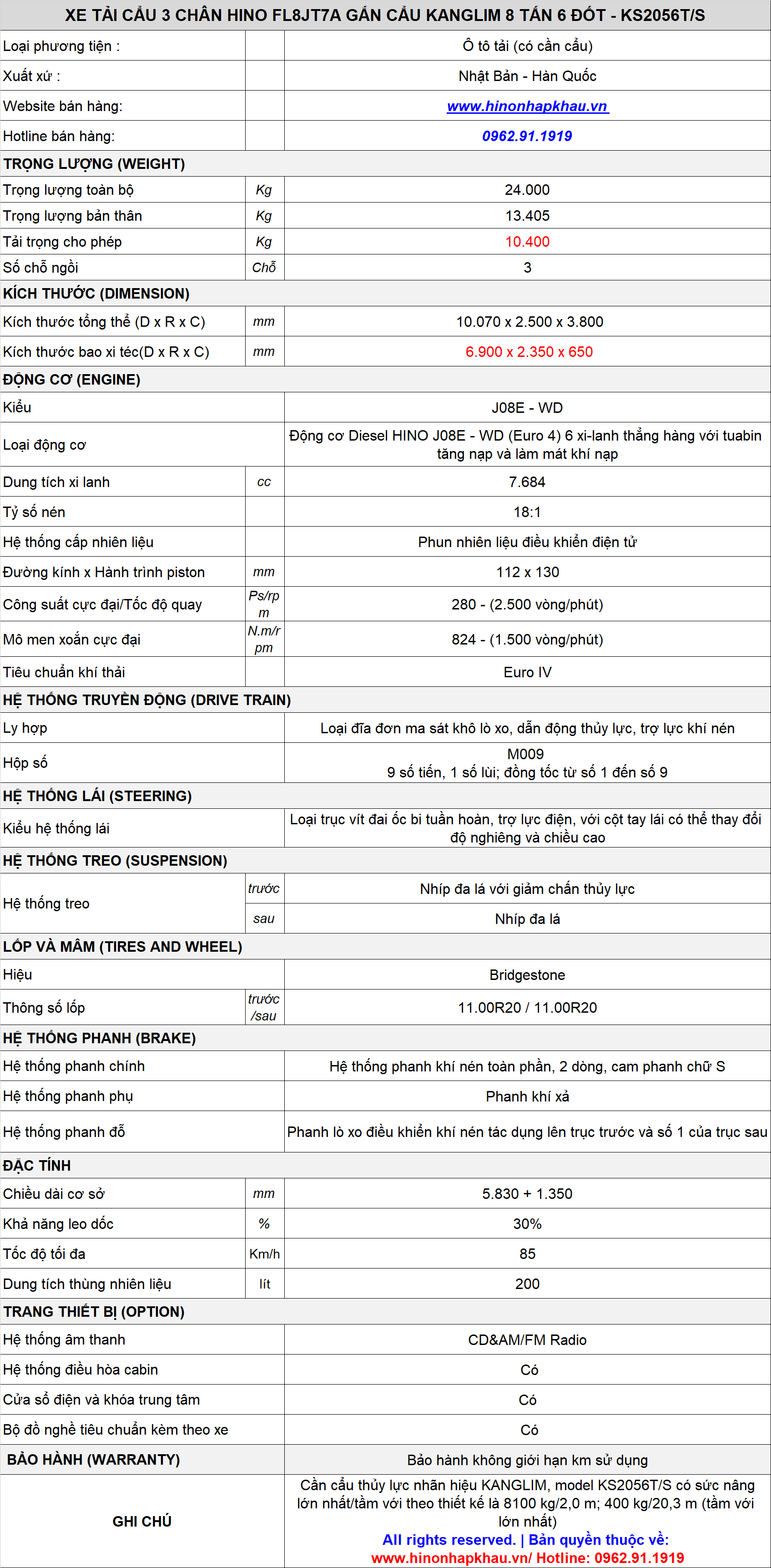 * THÔNG SỐ KỸ THUẬT XE TẢI CẨU 3 CHÂN HINO FL8JT7A LẮP CẨU KANGLIM 8 TẤN 6 ĐỐT KS2056T/S ĐỜI 2021 - 2022 TẠI HÀ NỘI:
