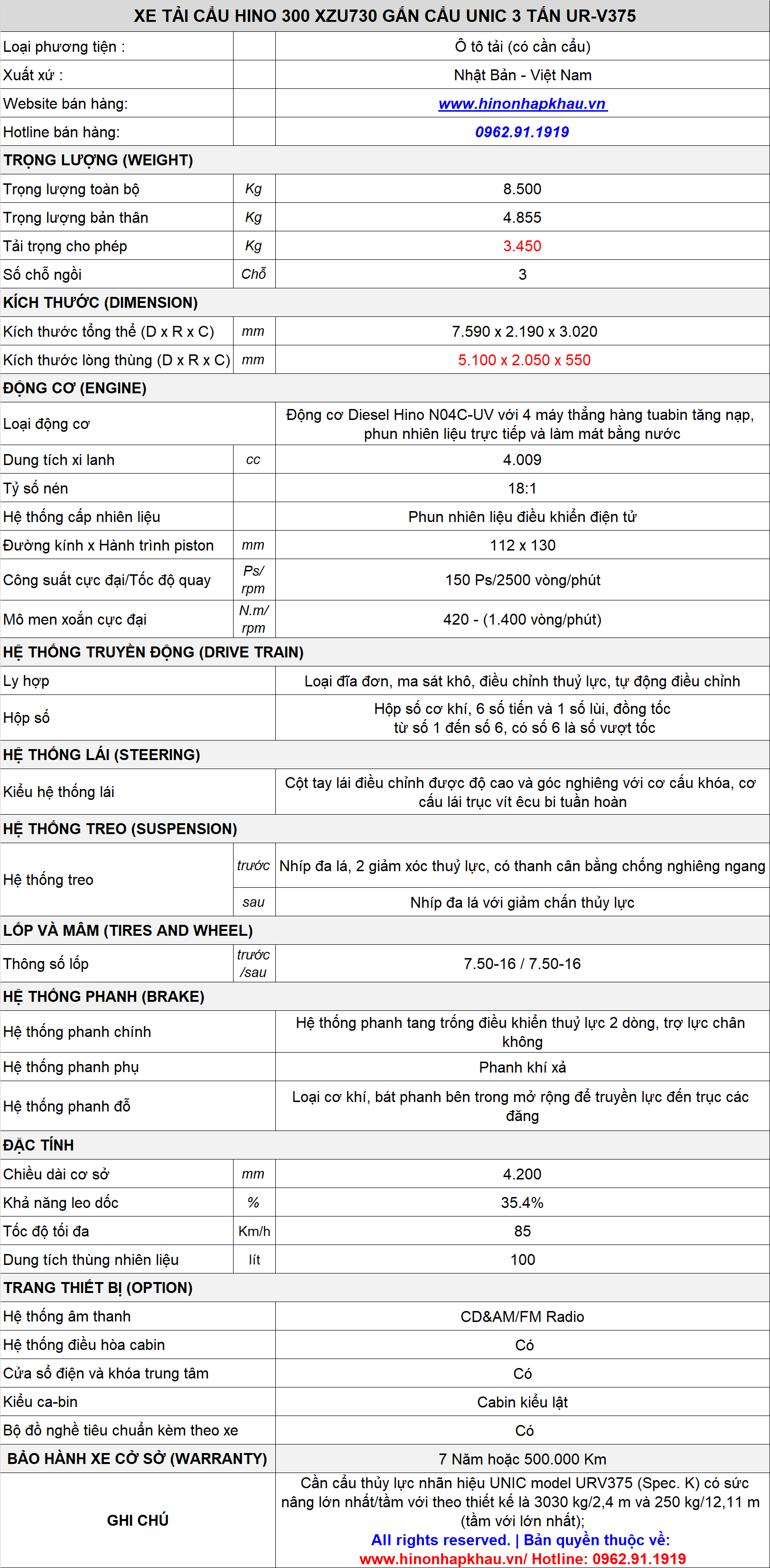 * THÔNG SỐ, ĐẶC TÍNH KỸ THUẬT XE TẢI CẨU HINO 300 XZU730 GẮN CẨU UNIC 3 TẤN UR-V375: