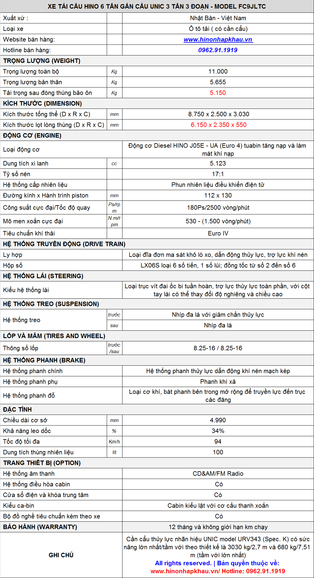 * THÔNG SỐ KỸ THUẬT XE TẢI GẮN CẨU HINO 6 TẤN LẮP CẨU UNIC 3 TẤN 3 ĐOẠN URV343K: