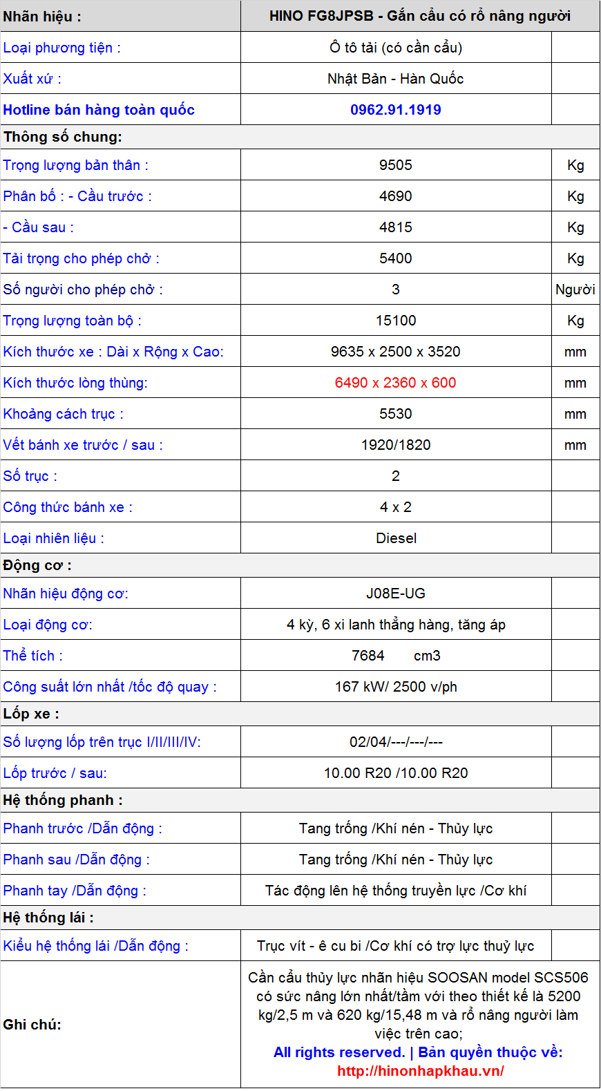 * THÔNG SỐ KỸ THUẬT XE CẨU HINO 8 TẤN GẮN CẨU 5.2 TẤN SOOSAN HÀN QUỐC CÓ RỔ NÂNG NGƯỜI TRÊN CAO: